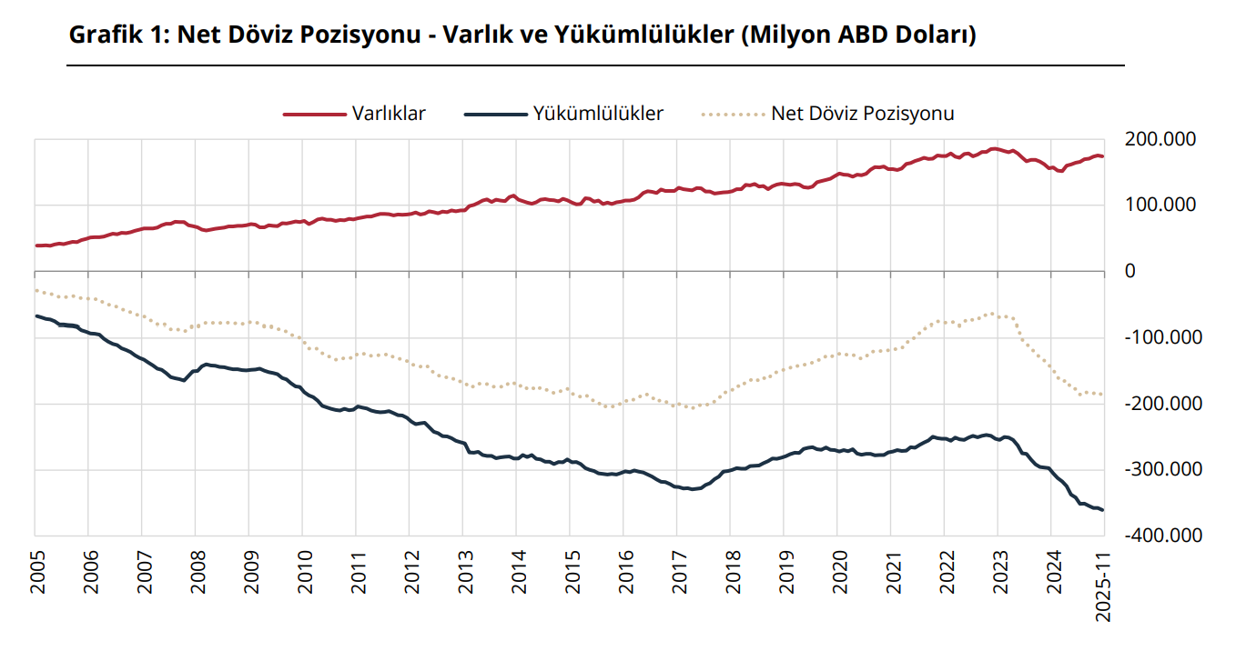 Türkiye Cumhuriyet Merkez Bankası tarafından açıklanan verilere göre finansal kesim haricindeki şirketlerin net döviz pozisyonu açığı, 2025 yılının kasım ayı itibarıyla 186 milyar 673 milyon dolar seviyesine çıktı. Türkiye Cumhuriyet Merkez Bankası verileri ışığında hazırlanan rapora göre, 2025 yılının kasım ayında bir önceki aya oranla finansal kesim dışında kalan firmaların döviz varlıklarında 1 milyar 517 milyon dolarlık bir düşüş yaşanırken, yükümlülükler tarafında ise 3 milyar 114 milyon dolarlık bir artış gözlendi. Yaşanan bu çift taraflı hareket neticesinde, reel sektörün net döviz pozisyonu açığı bir önceki aya göre 4 milyar 631 milyon dolar tutarında genişleyerek toplamda 186 milyar 673 milyon dolar seviyesine ulaştı. Varlık dağılımında görülen değişimler 2025 yılının kasım dönemine ilişkin varlık dağılım detayları analiz edildiğinde, ekim ayına kıyasla türev varlıkların 948 milyon dolar, yurt dışına yönelik doğrudan sermaye yatırımlarının 630 milyon dolar ve menkul kıymetlerin 69 milyon dolar seviyesinde yukarı yönlü hareket ettiği görüldü. Buna karşılık, yurt içindeki bankalarda tutulan mevduatlar 2 milyar 240 milyon dolar, ihracat kaynaklı alacaklar ise 924 milyon dolar tutarında gerileme kaydetti. Bu kalemlerdeki azalışların etkisiyle toplam varlık rakamı bir önceki aya göre 1 milyar 517 milyon dolar aşağı çekildi. Yükümlülükler ve borç stokundaki artış Şirketlerin yükümlülük kalemleri incelendiğinde ise ekim ayına nazaran yurt dışı kaynaklı nakdi kredilerin 1 milyar 599 milyon dolar, türev yükümlülüklerin 1 milyar 316 milyon dolar ve yurt içi kaynaklı nakdi kredilerin 451 milyon dolar arttığı saptandı. İthalat işlemlerinden kaynaklanan borçlar ise bu dönemde 251 milyon dolar seviyesinde bir azalma gösterdi. Tüm bu verilerin birleşmesi sonucunda toplam yükümlülük hacminde 3 milyar 114 milyon dolarlık bir genişleme meydana geldi. Borçların vade yapısı ele alındığında ise kasım ayında yurt içinden temin edilen kredilerde kısa vadeli olanların 80 milyon dolar, uzun vadeli olanların ise 371 milyon dolar arttığı izlendi. Yurt dışı kaynaklı kredilerde de benzer bir eğilimle kısa vadeli borçlar 289 milyon dolar, uzun vadeliler ise 1 milyar 59 milyon dolar yükseliş sergiledi. Dönem sonunda kısa vadeli varlıklar 139 milyar 939 milyon dolar, kısa vadeli yükümlülükler ise 133 milyar 19 milyon dolar olarak hesaplandı. Bu tablo sonucunda kısa vadeli net döviz pozisyon fazlası 6 milyar 920 milyon dolar olarak gerçekleşirken, bu fazlanın ekim ayına göre 3 milyar 795 milyon dolar azaldığı belirlendi. Ayrıca kısa vadeli yükümlülüklerin toplam içindeki payı yüzde 37 seviyesinde kaldı.
