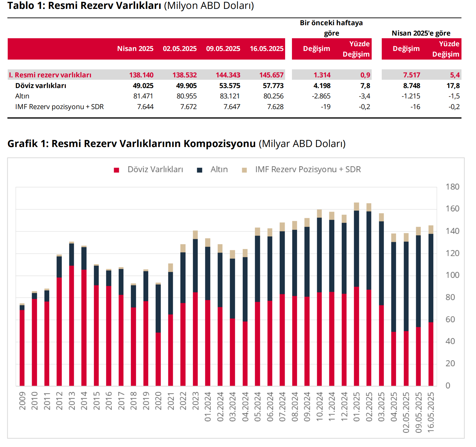 Türkiye Cumhuriyet Merkez Bankası (TCMB) toplam rezervleri geçtiğimiz hafta 1,4 milyar dolar artışla 145,7 milyar dolara yükseldi. TCMB tarafından "Uluslararası Rezervler ve Döviz Likiditesi Gelişmeleri" verileri yayımlandı. İlgili verilere göre resmi rezerv varlıkları, bir önceki haftaya kıyasla %0,9 artarak 145,7 milyar dolara çıktı. Bu dönemde döviz varlıkları, bir önceki haftaya göre %7,8 artarak 57,8 milyar dolar, altın cinsinden rezerv varlıkları %3,4 azalarak 80,3 milyar dolar, IMF rezerv pozisyonu ve SDR toplamı ise %0,2 azalarak 7,6 milyar dolar oldu. Kaynak: TCMB [news_id:772918]