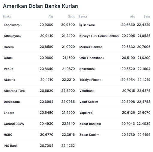Finansal veri sağlayıcısı Fenics’in verilerine göre, TL’nin bir yıllık öngörülen oynaklık göstergesi son 15 yılın en yüksek seviyesi olan yüzde 45,46’ya çıktı. Yatırımcılar, seçim sonuçlarına göre yeniden cumhurbaşkanı seçilen Recep Tayyip Erdoğan’ın ekonomi politikasında yapabileceği değişiklikleri beklerken, piyasalardaki hareketlilik ise hız kazandı. Buna göre, eleştirilen ekonomi politikalarında bir değişim yapılıp yapılmayacağı piyasaların ana odak noktası olmayı sürdürürken, Dolar/TL bugün saat 15.45 itibarıyla 20,71 seviyesinden işlem görüyor. Kapalıçarşı'da ise dolar kuru 20,95 seviyesinden fiyatlanıyor. Bankaların güncel alış satış rakamları ise şöyle: Kaynak: Doviz.com - ABD Doları – Banka Kurları