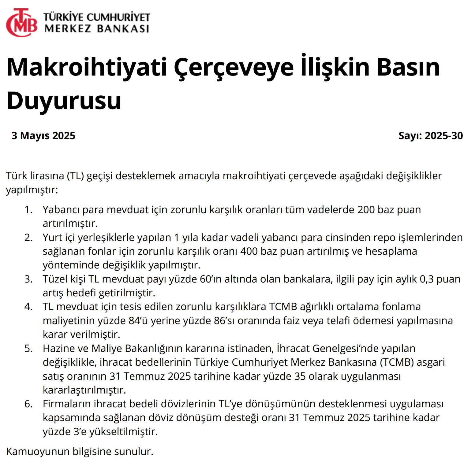 Türkiye Cumhuriyet Merkez Bankası (TCMB), Türk lirasına geçişi teşvik etmek ve finansal istikrarı güçlendirmek amacıyla bir dizi yeni düzenlemeye gitti. TCMB, Türk lirasına geçişi desteklemek amacıyla makroihtiyati çerçevede değişiklikler yapıldığını duyurdu. Buna göre yabancı para mevduat için zorunlu karşılık oranları tüm vadelerde 200 baz puan artırıldı. Yurt içi yerleşiklerle yapılan 1 yıla kadar vadeli yabancı para cinsinden repo işlemlerinden sağlanan fonlar için zorunlu karşılık oranı 400 baz puan artırıldı ve hesaplama yönteminde değişiklik yapıldı. Tüzel kişi TL mevduat payı yüzde 60’ın altında olan bankalara, ilgili pay için aylık 0,3 puan artış hedefi getirildi. TL mevduat için tesis edilen zorunlu karşılıklara TCMB ağırlıklı ortalama fonlama maliyetinin yüzde 84’ü yerine yüzde 86’sı oranında faiz veya telafi ödemesi yapılmasına karar verildi. Hazine ve Maliye Bakanlığının kararına istinaden, İhracat Genelgesi’nde yapılan değişiklikle, ihracat bedellerinin Türkiye Cumhuriyet Merkez Bankasına (TCMB) asgari satış oranının 31 Temmuz 2025 tarihine kadar yüzde 35 olarak uygulanması kararlaştırıldı. Firmaların ihracat bedeli dövizlerinin TL’ye dönüşümünün desteklenmesi uygulaması kapsamında sağlanan döviz dönüşüm desteği oranı 31 Temmuz 2025 tarihine kadar yüzde 3’e yükseltildi. Kaynak: TCMB [news_id:770565]