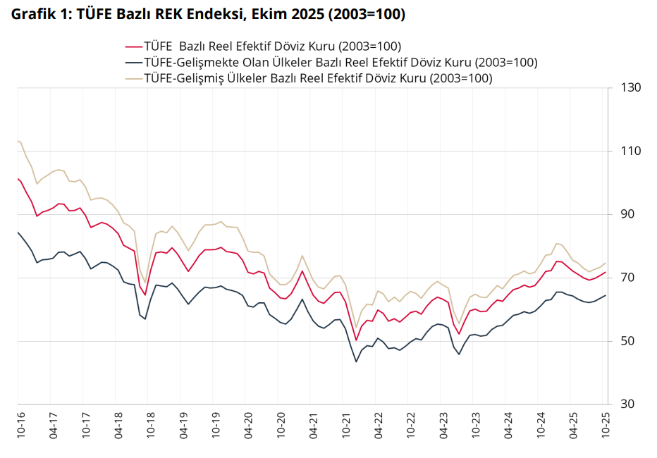 TÜFE bazlı Reel Efektif Döviz Kuru (REK) endeksi ekim ayında 71,87'ye yükselerek Nisan 2025'ten bu yana en yüksek düzeye çıktı. Türkiye Cumhuriyet Merkez Bankası (TCMB), TÜFE bazlı reel efektif kuru endeksi ekim verisini açıkladı. Reel Efektif Döviz Kuru (REK) endeksi, bir önceki aya göre 1,09 puan artarak 71,87'ye yükseldi. Endeks böylece Nisan 2025'ten beri en yüksek düzeye çıktı. Bu dönemde Yurt İçi Üretici Fiyat Endeksi (Yi-ÜFE) bazlı endeks ise ekim ayında bir önceki aya göre 0,79 puan artarak 95,53’e yükseldi. Reel efektif döviz kuru nedir? Reel efektif döviz kuru, Türk Lirası'nın satın alma gücünde olan değişimleri ortaya koyan bir veridir. Reel efektif kurun artışı Türk Lirası'nın değer kazandığını, Türk mallarının yabancı mallar cinsinden fiyatının arttığını gösteriyor. Reel efektif kurdaki düşüş yabancı mallar cinsinden fiyatın düşüşüne işaret ediyor. Reel efektif döviz kuru nasıl hesaplanır? Türkiye'nin dış ticaretinde önemli paya sahip ülkelerin para birimlerinden oluşan sepete göre, ikili ticaret akımları kullanılarak ağırlıklandırılan Türk Lirasının ortalama değeri ile nominal efektif döviz kuru hesaplanıyor. Nominal efektif döviz kurundan da nispi fiyat etkileri arındırılarak reel efektif döviz kuruna (REK) ulaşılıyor. REK, TÜFE, ÜFE ve birim işgücü maliyetlerden biriyle arındırılarak üç farklı alt endeks oluşturuyor. TCMB enflasyon hedefi kapsamında TÜFE bazlı REK'i esas alıyor.
