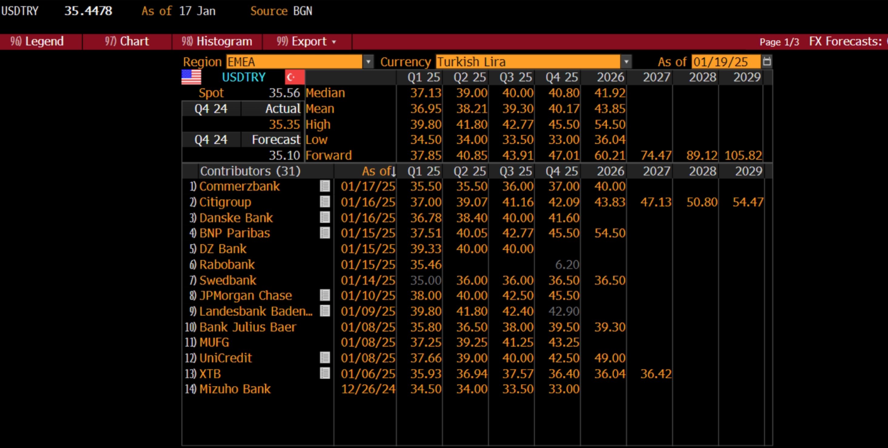 Türk lirası, TCMB’nin bu hafta açıklayacağı faiz kararı öncesinde dolar ve euro karşısında değer kaybını sürdürüyor. Peki, kurda 2025 sonuna yönelik beklentiler ne yönde? İşte detaylar.. ABD'de Trump döneminin başlamasına sayılı saat kala doların diğer önemli para birimleri karşısındaki performansını ölçen Dolar Endeksi yüzde 0,17 kayıpla 109,02 puandan işlem görüyor. Küresel piyasalarda dolarda yaşanan sınırlı kayıplara rağmen dolar/TL ise kademeli artışını sürdürerek tüm zamanların zirvesinden fiyatlanıyor. Buna göre dolar/TL, yeni haftanın ilk işlem gününde yüzde 0,28 artışla 35,5839'dan, euro/TL ise yüzde 0,65 artışla 36,7193 liradan işlem görüyor. [news_id:753237] Dolarda yıl sonuna yönelik beklentiler Türkiye Cumhuriyet Merkez Bankası Piyasa Katılımcıları Anketi'nde ekonomistlerin yıl sonu dolar kuru tahmini 43,03 lira olurken, yabancı kurumların tahminleri ise 33 lira ile 45,5 bandında değişiklik gösterdi. Buna göre JP Morgan ve BNP Paribas dolar/TL’nin 45,50 liraya yükselmesini beklerken, Japonya merkezli Mizuho Bank’ın son tahmini dolar/TL’de düşüş olacağı ve kurun yılı 33 seviyesinden kapatacağı yönünde oldu. Kaynak: SK - X [news_id:757701] Faiz kararı bekleniyor Döviz kurlarının seyri için piyasalar ise yurt içinde bu hafta açıklanacak faiz kararını beklemeye başladı. Perşembe günü açıklanacak faiz kararına ilişkin piyasaların beklentisi TCMB’nin aralık ayında olduğu gibi 250 baz puan indirime gitmesi yönünde. Yapılan tüm anketlerde 250 baz puanlık indirim öne çıkarken analistler ise faiz kararından çok karar metnindeki mesajların önemli olacağını bildirdi. Türkiye Ekonomi Politikaları Araştırma Vakfı (TEPAV) tarafından paylaşılan son notta da faiz indirimlerinin zamanlamasının enflasyon tahminleriyle uyumlu olmasının önemine dikkat çekilerek, enflasyonun ana eğiliminde bir miktar iyileşme görülmekle birlikte, yüksek bütçe açığı, kredi piyasasındaki kısıtlamalar ve kamu tarafından belirlenen fiyat artışlarının ekonomik istikrarı olumsuz etkileyebileceği uyarısında bulunuldu. [news_id:759595] [news_id:756205]