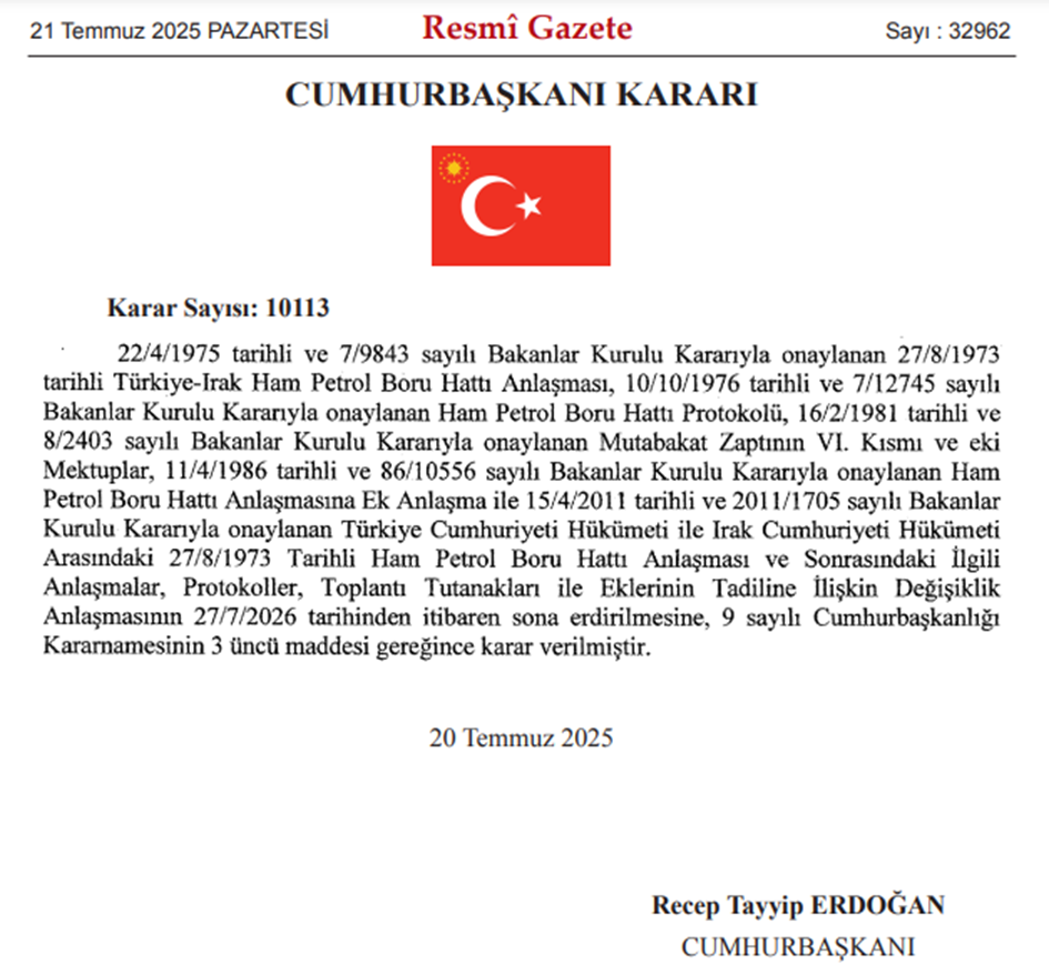 Resmi Gazete'de yayımlanan karara göre Türkiye ile Irak arasında 1973 yılında imzalanan Ham Petrol Boru Hattı Anlaşması, 2026 yılında sona erecek. Karar, Cumhurbaşkanı Erdoğan’ın imzasıyla Resmî Gazete'de yayımlandı. Resmî Gazete’de yer alan 10113 sayılı karara göre Türkiye ile Irak arasında 1973 yılında imzalanan anlaşmalar, protokoller ve bunlara ek belgelerin geçerliliği 27 Temmuz 2026 itibarıyla sona erecek. İki ülke arasında ilk olarak 1973’te imzalanan bu anlaşma, yıllar içinde çeşitli protokollerle güncellenmiş ve son olarak 2010 yılında 15 yıl süreyle uzatılmıştı. Kaynak: Resmi Gazete