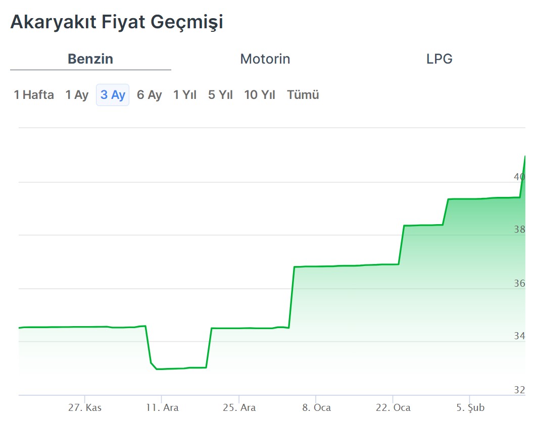 Benzinin litre fiyatında gece saatlerinden itibaren geçerli olacak şekilde artışa gidildi. İşte zam sonrası güncel akaryakıt fiyatları.. Akaryakıtta zamlara bir yenisi daha eklendi. Buna göre benzinin litre fiyatına gece saatlerinden itibaren geçerli olacak şekilde 1,54 TL zam yapıldı. Son zammın ardından bugünden itibaren geçerli olmak üzere İstanbul Avrupa yakasında motorinin litre fiyatı 40,94 TL’ye ulaştı. (Diğer il, ilçe ve dağıtım şirketi bazlı güncel fiyatlar ise akaryakıt sekmemizde listeleniyor.) Kaynak: Doviz.com - Akaryakıt Fiyatları Motorin fiyatlarında ise bir değişikliğe gidilmedi. Buna göre İstanbul Avrupa yakasında motorinin litre fiyatı ortalama 44,29 TL'den satılmaya devam ediyor. Motorinin litre fiyatına geçtiğimiz günlerde 2,59 TL zam yapılmıştı. Akaryakıt fiyatları nasıl hesaplanıyor? Türkiye'de benzin ve motorin fiyatları hesaplanırken; Gümrüksüz rafineri fiyatına ÖTV ve EPDK payının eklenmesiyle KDV hariç Rafineri satış fiyatı bulunuyor. Gümrüksüz Rafineri Fiyatı hesaplanırken ise Akdeniz-İtalyan piyasasında yayınlanan günlük CIF Akdeniz ürün fiyatları ve günlük dolar kuru takip edilerek, belli bir fiyat değişim farkında gümrüksüz rafineri tavan satış fiyatı elde ediliyor. [news_id:723834]