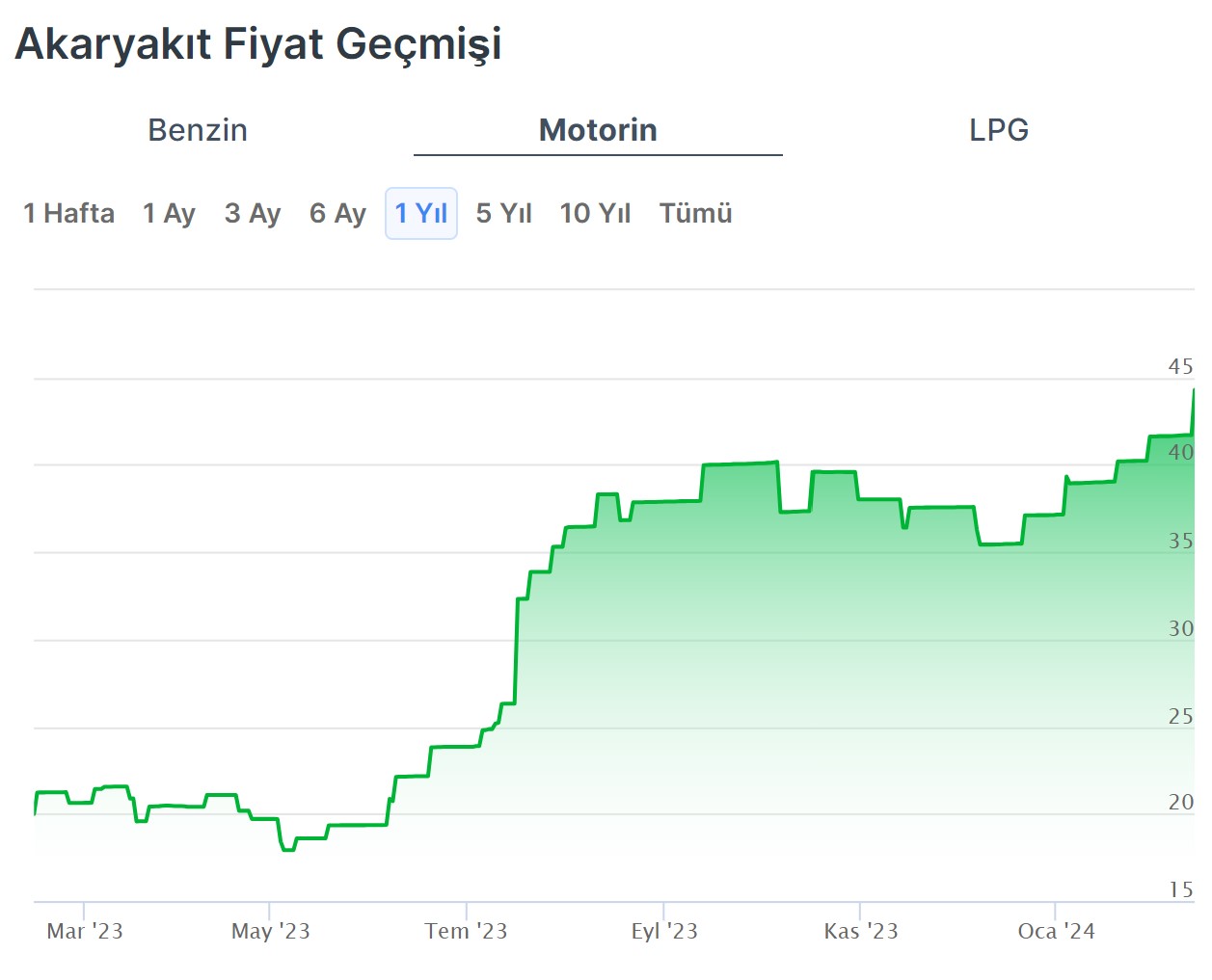 Motorinin litre fiyatında gece saatlerinden itibaren geçerli olacak şekilde artışa gidildi. İşte zam sonrası güncel akaryakıt fiyatları.. Akaryakıtta zamlara bir yenisi daha eklendi. Buna göre motorinin litre fiyatına gece saatlerinden itibaren geçerli olacak şekilde 2,59 TL zam yapıldı. Son zammın ardından bugünden itibaren geçerli olmak üzere İstanbul Avrupa yakasında motorinin litre fiyatı 44,29 TL’ye ulaştı. Motorine yapılan son zammın ardından yılbaşından bu yana fiyatlar yüzde 18,5 artarken, seçimlerden bu yana bakıldığında ise motorin fiyatlarında yüzde 129 artış gerçekleşti. Kaynak: Doviz.com – Akaryakıt Fiyatları Benzin fiyatlarında bir değişikliğe gidilmez iken benzinin litre fiyatı 39,40 TL'de sabit kaldı. Böylelikle motorine yapılan zammın ardından benzin ile motorin arasındaki makas da 5 TL'ye yaklaştı. Akaryakıt fiyatları nasıl hesaplanıyor? Türkiye'de benzin ve motorin fiyatları hesaplanırken; Gümrüksüz rafineri fiyatına ÖTV ve EPDK payının eklenmesiyle KDV hariç Rafineri satış fiyatı bulunuyor. Gümrüksüz Rafineri Fiyatı hesaplanırken ise Akdeniz-İtalyan piyasasında yayınlanan günlük CIF Akdeniz ürün fiyatları ve günlük dolar kuru takip edilerek, belli bir fiyat değişim farkında gümrüksüz rafineri tavan satış fiyatı elde ediliyor. [news_id:724055]