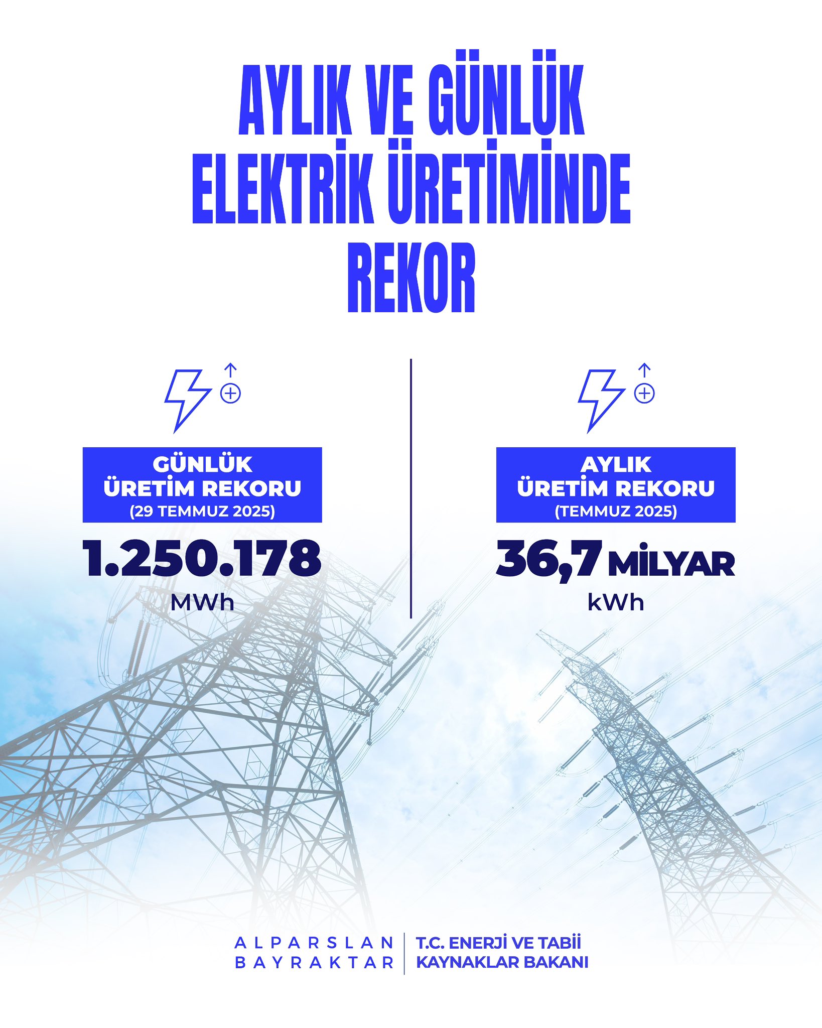 Enerji ve Tabii Kaynaklar Bakanı Alparslan Bayraktar, Türkiye'nin temmuzda elektrik üretiminde günlük ve aylık bazda rekor kırdığını bildirdi. Bakanlıktan yapılan yazılı açıklamaya göre, Türkiye, temmuzda elektrik üretiminde, anlık, saatlik, günlük ve aylık bazda yükselen talebi karşılamada başarılı bir sınav verdi. Bu dönemde toplam elektrik üretimi 36,7 milyar kilovatsaate çıkarak en yüksek aylık üretim değeri olarak kayıtlara geçti. Günlük bazda elektrik üretimi de temmuzda zirve yaptı. 29 Temmuz'da maksimum günlük elektrik üretimi 1 milyon 250 bin 178 megavatsaatle rekor kırdı. Açıklamada görüşlerine yer verilen Bakan Bayraktar, Türkiye'nin temmuzda elektrik üretiminde günlük ve aylık bazda rekor kırdığını belirterek, şunları kaydetti: "29 Temmuz'da günlük üretimimiz 1 milyon 250 bin megavatsaat seviyesine ulaştı. Aylık üretimimiz ise 36,7 milyar kilovatsaat ile tüm zamanların en yüksek seviyesini gördü. Bu dönemde zirveye çıkan elektrik talebinin yüzde 60'ını yerli ve yenilenebilir kaynaklardan karşıladık. Enerji arz güvenliğimizi koruyarak, milletimizin ihtiyacını yerli ve milli kaynaklarımızla karşılamaya devam edeceğiz." Kaynak: Alparslan Bayraktar