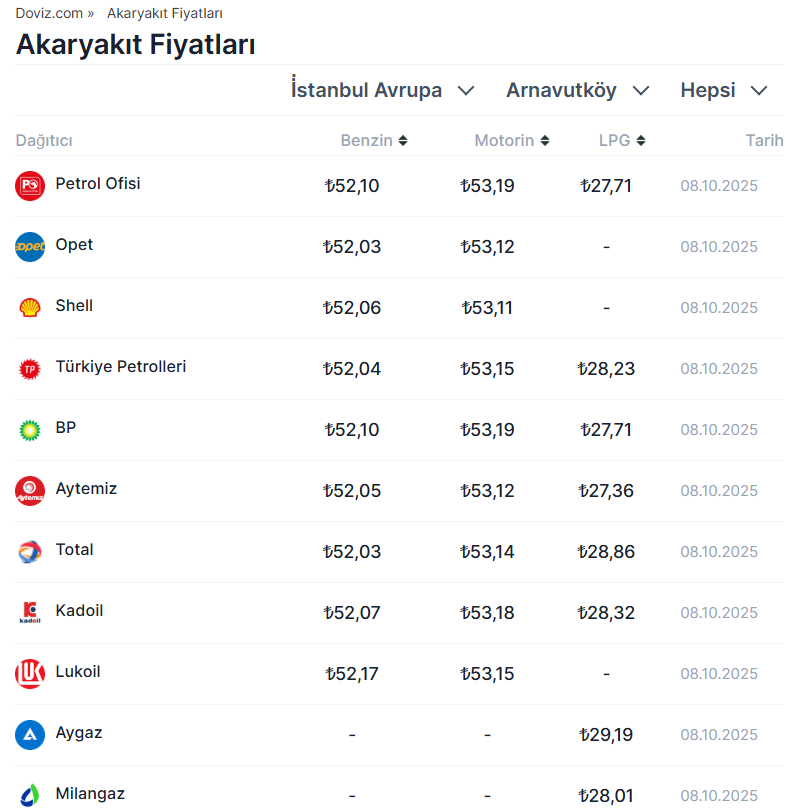 Benzin ve motorin fiyatlarında gece saatlerinden itibaren geçerli olmak üzere indirime gidildi. İşte indirim sonrası 8 Ekim 2025 itibarıyla güncel akaryakıt fiyatları.. Brent petrolün son dört ayın en düşük seviyelerinden fiyatlanmasının ardından akaryakıt fiyatlarında indirime gidildi. Bu kapsamda gece saatleri itibarıyla benzine 1 lira 26 kuruş, motorine ise 1 lira 36 kuruş indirim geldi. Akaryakıta yapılan bu indirimler pompa fiyatlarına da yansıtıldı. Gece yarısı yapılan indirimler sonrasında güncel pompa fiyatlarına göre; İstanbul Avrupa yakasında motorin litresi 53,19 liradan, benzinin litresi 52,10 liradan satılmaya başlandı. Dağıtım şirketi bazlı akaryakıt fiyatları ise şöyle listelendi: Kaynak: Doviz.com - Akaryakıt Fiyatları Akaryakıt fiyatları nasıl hesaplanıyor? Türkiye'de benzin ve motorin fiyatları hesaplanırken; Gümrüksüz rafineri fiyatına ÖTV ve EPDK payının eklenmesiyle KDV hariç Rafineri satış fiyatı bulunuyor. Gümrüksüz Rafineri Fiyatı hesaplanırken ise, Akdeniz-İtalyan piyasasında yayınlanan günlük CIF Akdeniz ürün fiyatları ve günlük dolar kuru takip edilerek, belli bir fiyat değişim farkında gümrüksüz rafineri tavan satış fiyatı elde ediliyor. [news_id:787081]