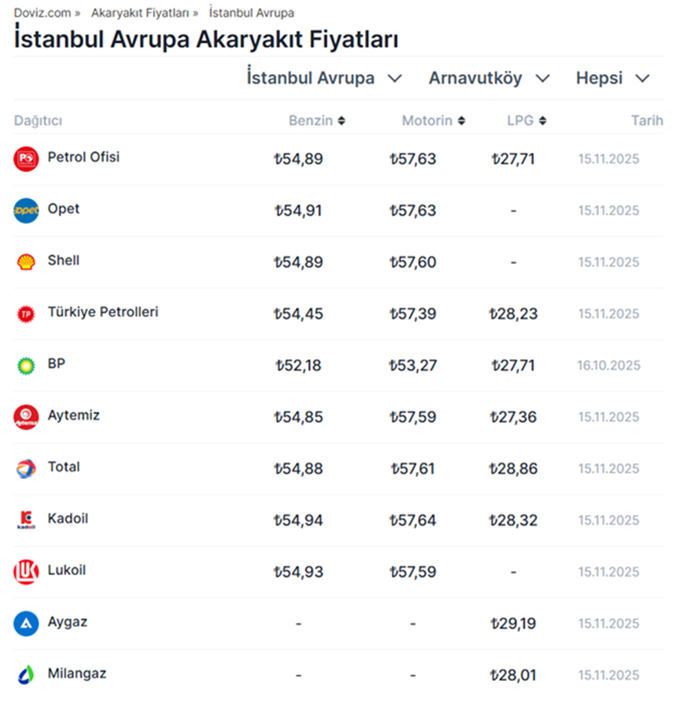 Benzinin litresine gece saatlerinden itibaren geçerli olacak şekilde zam yapıldı. İşte 15 Kasım 2025 itibarıyla 7 ilde güncel akaryakıt fiyatları.. Geçtiğimiz haftalarda motorine gelen zamların ardından bugün gece saatleri itibarıyla benzin fiyatında artışa gidildi. Buna göre benzinin litresine bugünden itibaren geçerli olacak şekilde ortalama 1 lira 15 kuruş zam yapıldı. Motorin ve LPG fiyatlarında ise herhangi bir değişime gidilmedi. Zammın ardından İstanbul Avrupa yakasında benzinin litresi 54,89 lira, Ankara'da 55,76 lira, Bursa'da 55,90 lira, İzmir'de 56,09 lira, Samsun'da 56,40 lira, Antalya'da 57,04 lira, Diyarbakır'da ise 57,08 lira oldu. Akaryakıt fiyatları nasıl hesaplanıyor? Türkiye'de benzin ve motorin fiyatları hesaplanırken; Gümrüksüz rafineri fiyatına ÖTV ve EPDK payının eklenmesiyle KDV hariç Rafineri satış fiyatı bulunuyor. Gümrüksüz Rafineri Fiyatı hesaplanırken ise Akdeniz-İtalyan piyasasında yayınlanan günlük CIF Akdeniz ürün fiyatları ve günlük dolar kuru takip edilerek, belli bir fiyat değişim farkında gümrüksüz rafineri tavan satış fiyatı elde ediliyor. [news_id:791870]