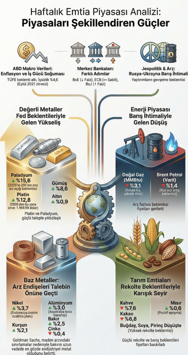 Emtia piyasalarında hafta boyunca yön arayışı öne çıktı. ABD’den gelen veriler ve küresel gelişmeler, farklı emtia gruplarında birbirinden ayrışan fiyat hareketlerini beraberinde getirdi. ABD’de açıklanan enflasyon ve istihdam verilerinin ardından değerli metallerde yükseliş izlenirken, jeopolitik başlıkların etkisiyle enerji emtialarında zayıf bir görünüm dikkat çekti. Baz ve tarım emtialarında ise hafta genelinde karışık bir tablo oluştu. Makro veriler ve merkez bankaları fiyatlamaları etkiledi ABD’de tamamlanan haftada açıklanan makroekonomik veriler, enflasyondaki yavaşlamaya işaret ederken Federal Reserve’in gelecek yıl faiz oranlarında ilave indirimlere gidebilmesi için alan oluşabileceği yönündeki beklentileri güçlendirdi. ABD Çalışma Bakanlığı verilerine göre Tüketici Fiyat Endeksi kasımda aylık yüzde 0,2, yıllık bazda yüzde 2,7 artarak beklentilerin altında kaldı. Değişken enerji ve gıda fiyatlarını içermeyen çekirdek TÜFE de kasımda aylık yüzde 0,2, yıllık yüzde 2,6 artış gösterdi ve beklentilerin altında gerçekleşti; çekirdek enflasyon bu dönemde yıllık bazda Mart 2021’den bu yana en düşük seviyesini kaydetti. Ilımlı enflasyon verilerine ilişkin değerlendirmede bulunan New York Fed Başkanı John Williams, kasım enflasyonunun bazı teknik faktörler nedeniyle düşük göründüğünü ifade etti. İş gücü piyasası verilerinde ise soğuma belirtileri izlendi. Tarım dışı istihdam kasımda 64 bin kişi artarak beklentilerin üzerinde gerçekleşti; ekim ayında istihdamın 105 bin kişi azaldığı hesaplanırken ağustos ve eylül verilerinde de aşağı yönlü revizyona gidildi. İşsizlik oranı kasımda yüzde 4,6’ya yükselerek Eylül 2021’den bu yana en yüksek seviyesine ulaştı. ADP Araştırma Enstitüsü verileri, özel sektör istihdamının 29 Kasım’da sona eren dört haftalık dönemde haftalık ortalama 16 bin 250 kişi arttığını gösterdi. Analistler, kasımda istihdam artışının beklentileri aşmasına karşın ağustos ve eylül verilerindeki aşağı yönlü revizyonların iş gücü piyasasına ilişkin endişeleri yeniden gündeme taşıdığını, verilerin belirgin bir zayıflamadan çok sınırlı bir soğumaya işaret ederek Fed’in 2026’da faiz indirimlerini sürdürebileceği beklentilerini desteklediğini kaydetti. Hafta boyunca Avrupa Merkez Bankası, Japonya Merkez Bankası ve İngiltere Merkez Bankası kararları da yatırımcıların odağında yer aldı. İngiltere Merkez Bankası politika faizini 25 baz puan indirerek yüzde 3,75’e çekti ve bu yıl toplam gevşeme 100 baz puana ulaştı. ECB üç temel politika faizini sabit tuttu; ECB Başkanı Christine Lagarde, enflasyon görünümünün dalgalı uluslararası ortam nedeniyle belirsizliğini koruduğunu söyledi. Japonya Merkez Bankası ise politika faizini 25 baz puan artırarak yüzde 0,75’e yükseltti ve bu seviye son 30 yılın en yüksek düzeyi olarak kayıtlara geçti. Jeopolitik gelişmeler enerji emtiaları üzerinde baskı oluşturdu. Rusya-Ukrayna Savaşı’nda ABD ve müttefiklerinin barış görüşmelerinde ilerleme kaydedildiğini açıklaması, savaşın sona erebileceği ve Rus enerji ihracatına yönelik yaptırımların hafifleyebileceği beklentilerini güçlendirdi. Bu gelişmelerin ardından ABD’nin 10 yıllık tahvil faizi haftayı yüzde 4,15 seviyesinden tamamladı, dolar endeksi yüzde 0,2 yükselişle 98,6’ya çıktı. Noel tatili nedeniyle gelecek hafta işlem hacminin düşmesi beklenirken yatırımcıların odağına ABD’nin üçüncü çeyrek büyüme verileri yerleşti. Değerli metallerde yükseliş, platin ve paladyum öne çıktı Değerli metaller, ABD’de açıklanan makroekonomik verilerin Fed’in faiz indirimine yönelik beklentileri güçlendirmesiyle haftayı yükselişle tamamladı. ABD ile Ukrayna arasındaki kritik barış görüşmelerinde ilerleme sağlanması güvenli liman talebini sınırladı. Altının ons fiyatı hafta içinde 4 bin 374,77 dolara kadar yükselerek tüm zamanların en yüksek seviyesi olan 4 bin 381,55 dolara yakın seyretti ve haftayı 4 bin 338,58 dolardan tamamladı. Gümüşün ons fiyatı hafta içinde 67,46 dolara çıkarak rekor tazeledi ve haftayı 67,16 dolardan kapattı. Yıl boyunca altın ve gümüşün gerisinde kalan platin ve paladyumda da yükseliş görüldü. Platinin ons fiyatı 1.982,57 doları görerek 2008’den bu yana en yüksek seviyesine ulaştı ve haftayı 1.969,98 dolardan tamamladı; platinde tüm zamanların en yüksek seviyesi 2008 yılında görülen 2 bin 302 dolar olarak kayıtlara geçti. Paladyumun ons fiyatı 1.723,04 doları görerek 2023 Şubat’tan bu yana en yüksek seviyesine çıktı ve haftayı 1.709,31 dolardan tamamladı. Dünyanın en büyük paladyum üreticisi Rus madencilik şirketi Nornickel, yatırım talebinin de etkisiyle 2025’te paladyum piyasasında yaklaşık 200 bin ons arz açığı oluşabileceğini bildirdi. Haftalık bazda ons fiyatlar gümüşte yüzde 8,6, paladyumda yüzde 15,6, platinde yüzde 12,8 ve altında yüzde 0,9 değer kazandı. Baz, enerji ve tarım emtialarında ayrışan görünüm Baz metaller, Çin kaynaklı talep endişelerine karşın arz endişelerinin sürmesi ve zayıf dolar endeksinin desteğiyle çinko hariç haftayı pozitif seyirle tamamladı. Çin’de kasım ayına ilişkin veriler sanayi üretiminin yıllık yüzde 4,8 artarak son 15 ayın en yavaş hızına indiğini, perakende satışların ise yüzde 1,3 ile Aralık 2022’den bu yana en düşük artışı kaydettiğini gösterdi. Bakır fiyatları, Goldman Sachs’ın maden arzındaki kısıtlamalara işaret eden yukarı yönlü tahminlerinin etkisiyle değer kazandı. Alüminyum fiyatları, Avustralyalı üretici South32’nin Mozal alüminyum tesisini martta kapatacağını duyurmasının ardından yükseliş eğilimi gösterdi. 
