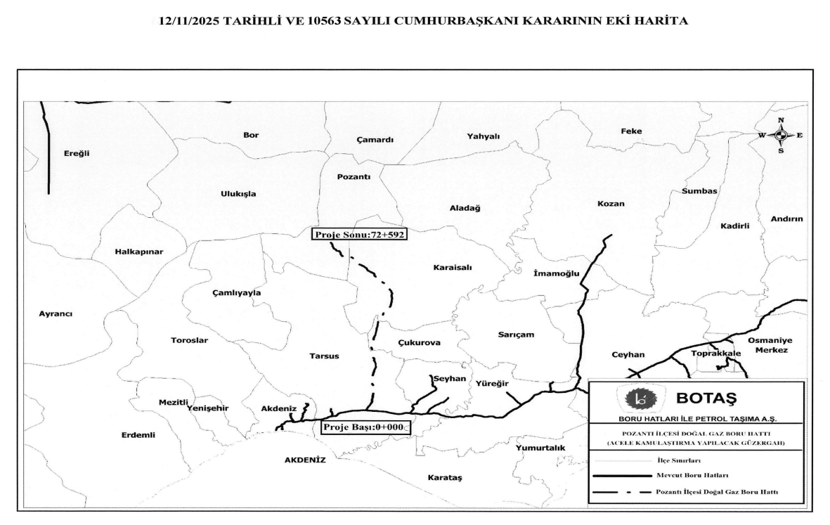 Adana ve Sivas'ta gerçekleştirilecek doğal gaz projelerinin yer aldığı alanlar için acele kamulaştırma kararı alındı. Adana ve Sivas'ta gerçekleştirilecek doğal gaz projelerinin güzergahındaki taşınmazlar acele kamulaştırılacak. Konuya ilişkin Cumhurbaşkanı kararları, Resmi Gazete'nin bugünkü sayısında yayımlandı. İlgili karara göre, Adana'da bulunan Pozantı İlçesi Doğal Gaz Boru Hattı Projesi'nin gerçekleştirilmesi amacıyla güzergaha isabet eden taşınmazlar ile proje kapsamında inşa edilecek sabit tesisler, ulaşım yolları, enerji nakil hatları, katodik koruma hatları ve anot yataklarının yapımı amacıyla ihtiyaç duyulan taşınmazlar, mülkiyet şeklinde ya da daimi/geçici irtifak hakkı kurulmak suretiyle Boru Hatları ile Petrol Taşıma AŞ Genel Müdürlüğü tarafından acele kamulaştırılacak. Ayrıca, doğal gaz dağıtım faaliyetleri için ihtiyaç duyulan Sıkıştırılmış Doğal Gaz ve Sıvılaştırılmış Doğal Gaz (CNG/LNG) Tesis Alanı yapımı amacıyla Sivas'ta bulunan taşınmaz, tapuda Hazine adına tescil edilmek üzere Enerji Piyasası Düzenleme Kurumu tarafından acele kamulaştırılacak.