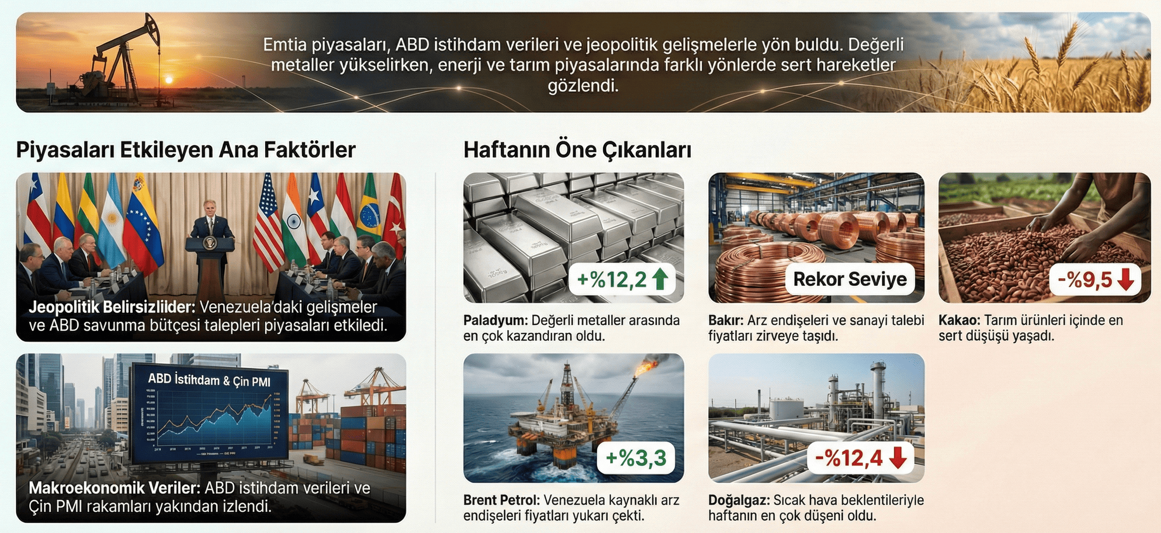 ABD istihdam verileri ve küresel siyasi belirsizlikler emtia piyasalar üzerinde yön belirleyici bir etki yarattı. Emtia piyasaları, ABD'den gelen istihdam rakamları ve Venezuela merkezli jeopolitik gelişmelerin gölgesinde hareketli bir haftayı geride bıraktı. ABD yönetiminin Venezuela'ya yönelik askeri adımlarının ardından Devlet Başkanı Nicolas Maduro'nun ùlkeden ayrılması yatırımcılar tarafından yakından takip edildi. Bu süreçte Donald Trump'ın 2027 yılı için 1,5 trilyon dolarlık savunma bütüesi talebi ve Grönland üzerindeki stratejik beklentileri piyasaların odağına yerleşti. Makroekonomik veriler ve faiz beklentileri ABD'de tarım dışı istihdamın 50 bin ile beklentilerin gerisinde kalmasına rağmen işsizlik oranı yüzde 4,4 seviyesine indi. Çin tarafında ise imalat PMI verisinin 50,1'e yükselerek 8 aylık daralma dönemini bitirmesi, küresel talep yönlü iyimserliğini destekledi. Analistler, bu verilerin Fed'in faiz indirim sürecine dair beklentileri canlı tuttuğunu ve değetli metallerdeki düşüş risklerini kısıtladığını vurguladı. Değetli metaller ve sanayi emtiasında yükseliş Haftanın en çok kazandıran değetli metali yüzde 12,2 ile paladyum oldu. Paladyumu yüzde 10,2 ile gümüş, yüzde 6 ile platin ve yüzde 4,1 ile altın izledi. Sanayi metalleri tarafında ise bakır fiyatları, arz endişeleri ve savunma sanayisine yünelik yatırım beklentileriyle rekor seviyelere ulaştı. Nikel yüzde 5,6, alüminyum ise yüzde 4,1 değerde kazandı. Enerji ve tarım piyasalarındaki değerişim Brent petrolün varil fiyatı, Venezuela kaynaklı arz endişeleriyle haftayı yüzde 3,3 artışla tamamlarken, doğalgaz fiyatları sıcak hava tahminleriyle yüzde 12,4 düşüş gösterdi. Tarım tarafında ise pirinç yüzde 6,1 artarken, kakao fiyatlarında yüzde 9,5'lik sert bir gerileme yaşandı. Brezilya'daki hava koşulları soya fasulyesi ve mısır fiyatları üzerinde etkisini sürdürdü.