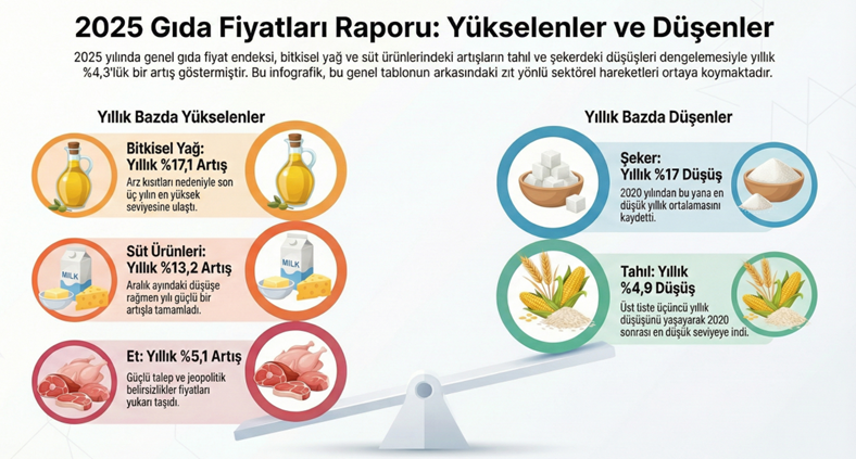 Birleşmiş Milletler Gıda ve Tarım Örgütü (FAO), küresel gıda fiyat endeksinin 2025 yılını bir önceki yıla oranla yüzde 4,3 artışla tamamladığını duyurdu. Dünya genelinde gıda emtia fiyatlarının aylık değişimlerini takip eden FAO Gıda Fiyat Endeksi'nin Aralık 2025 sonuçları kamuoyuyla paylaşıldı. Elde edilen verilere göre endeks, aralık ayında bir önceki aya göre yüzde 0,6 oranında azalırken, Aralık 2024 dönemine göre ise yüzde 2,3 düşüş göstererek ortalama 124,3 puan seviyesine geriledi. 2025 yılının genelinde ise bitkisel yağ ve süt ürünlerindeki fiyat artışlarının, tahıl ve şeker fiyatlarındaki düşüşleri dengelemesiyle genel endeks yıllık bazda yüzde 4,3 yükseliş kaydetti. Alt sektörlerdeki fiyat değişimleri ve yıllık performanslar Şeker Fiyat Endeksi, Brezilya'daki üretim bölgelerinde yaşanan düşüşlerin etkisiyle aralık ayında kasım ayına göre yüzde 2,4 artış gösterdi. Buna karşın endeks, 2025 yılını bir önceki yılın yüzde 17 altında kapatarak 2020 yılından bu yana en düşük yıllık ortalamasını gördü. Bitkisel Yağ Fiyat Endeksi ise aralıkta yüzde 0,2 gerileyerek son altı ayın en düşük seviyesine indi ancak yıllık bazda arz kısıtları nedeniyle yüzde 17,1 artarak son üç yılın zirvesine ulaştı. Tahıl ve hayvansal ürünlerdeki son durum Tahıl Fiyat Endeksi, Karadeniz buğday sevkiyatı endişeleri ve artan mısır talebiyle aralık ayında yüzde 1,7 yükseldi. Buna rağmen yıllık bazda yüzde 4,9 gerileyerek üst üste üçüncü yıllık düşüşünü yaşadı ve 2020 sonrası en düşük ortalamayı kaydetti. Süt ürünleri fiyatları aralıkta yüzde 4,4 gerilerken, 2025 yılının genelini yüzde 13,2 artışla bitirdi. Et Fiyat Endeksi ise aralıkta yüzde 1,3 düşüş yaşasa da, 2025 yılı genelinde güçlü talep ve jeopolitik belirsizlikler sebebiyle bir önceki yıla göre yüzde 5,1 oranında artış sağladı. [news_id:796253]