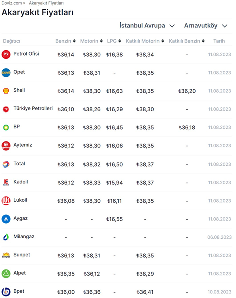 Gece saatleri itibarıyla motorine gelen son zam pompa fiyatlarına da yansıdı. Gerçekleşen zammın ardından benzin ve motorin makası da yeniden açılmış oldu. Küresel petrol üreticilerinin arz yönlü kesinti kararlarının ardından brent petrolde yaşanan değişim ve döviz kurundaki yükseliş sonrasında akaryakıt fiyatlarında da hareketlilik arttı. Buna göre, 11 Ağustos Cuma günü gece saatleri itibarıyla motorine 1,80 TL zam yapıldı. Benzin ve LPG fiyatlarında ise herhangi bir değişiklik olmadı. Akaryakıt fiyatlarındaki bu değişimin ardından güncel pompa fiyatlarına göre; İstanbul'da motorin litre fiyatı 38,30 liradan, Benzinin litresi 36,12 liradan, LPG'nin litre fiyatı ise 16,49 liradan satılmaya başlandı. Dağıtım şirketi bazlı akaryakıt fiyatları ise şöyle: Kaynak: Doviz.com – Akaryakıt Fiyatları