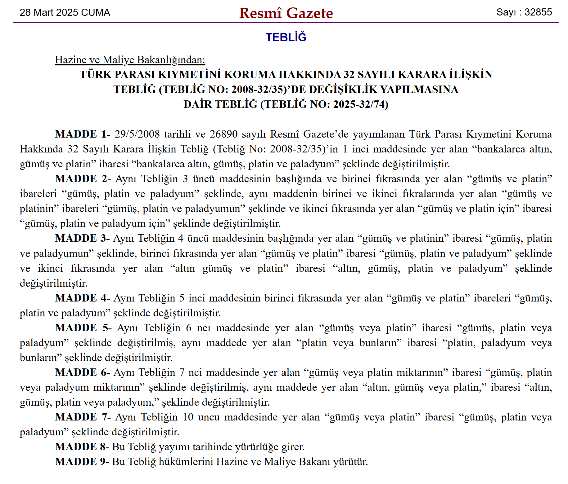 Hazine ve Maliye Bakanlığı, Resmi Gazete’de yayımlanan tebliğ ile paladyumu bankalar tarafından kabul edilebilecek değerli metaller arasına ekledi. Hazine ve Maliye Bakanlığı, kıymetli metallerle ilgili düzenlemelerde önemli bir değişikliğe imza attı. Resmi Gazete’de yayımlanan tebliğ ile paladyum, bankalar tarafından kabul edilebilecek değerli metaller arasına eklendi. Yeni düzenleme kapsamında, bankalar artık altın, gümüş ve platinle birlikte paladyum için de depo hesabı açabilecek. Ayrıca, bankalar tarafından altın, gümüş ve platin kredisi sağlanmasının yanı sıra paladyum kredisi de verilebilecek. Kıymetli maden aracı kuruluşları ise yurt dışından paladyum kredisi temin edebilecek. Bankalar, Türkiye’de ve yurt dışında yerleşik gerçek ve tüzel kişiler adına vadeli veya vadesiz paladyum depo hesapları açabilecek. Bu hesaplar, fiziki paladyum teslimi, yurt içi veya yurt dışı banka transferleri ya da bankalar aracılığıyla satış yoluyla oluşturulabilecek.