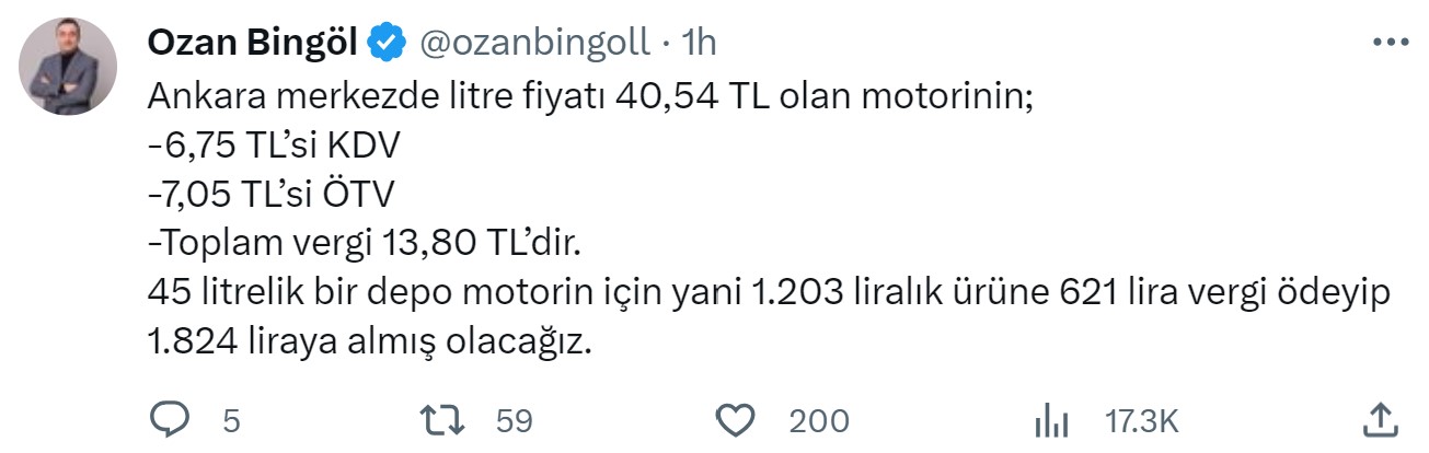 Dolar kurundaki artış ve brent petrolün 92 dolar seviyesine kadar çıkması ile motorine bir zam daha geldi. Böylece motorinin litresi 40 liraya ulaştı. Vergi Uzmanı Ozan Bingöl ise yeni zam sonrasında motorinden alınan vergi miktarını hesapladı. Konuyla ilgili sosyal medya platformu “X” üzerinden yaptığı hesaplamayı paylaşan Bingöl, şu ifadeleri kullandı: “Ankara merkezde litre fiyatı 40,54 TL olan motorinin; 6,75 TL’si KDV, 7,05 TL’si ÖTV, Toplam vergi 13,80 TL’dir. 45 litrelik bir depo motorin için yani 1.203 liralık ürüne 621 lira vergi ödeyip 1.824 liraya almış olacağız.” Kaynak: Ozan Bingöl - X [news_id:707238]