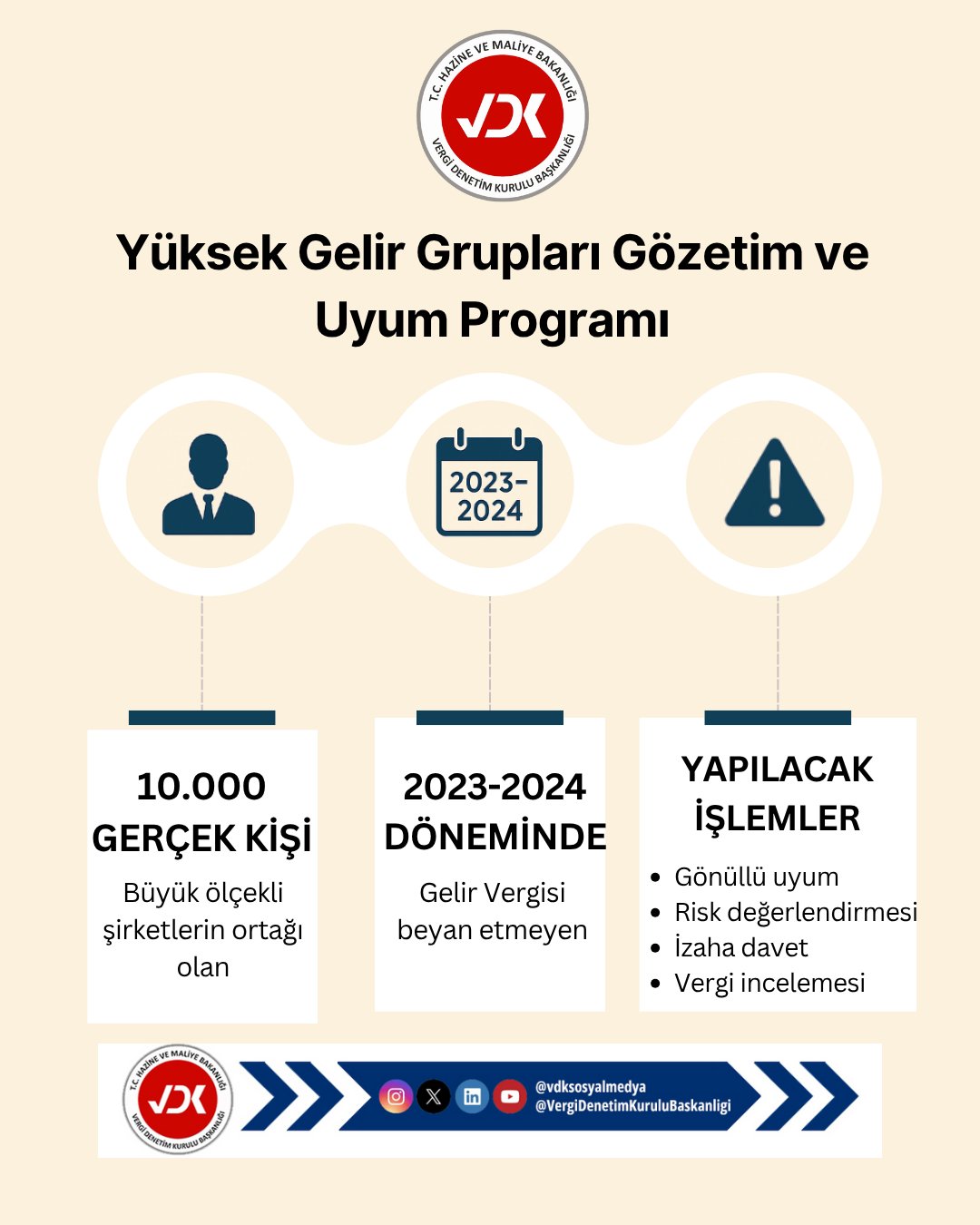 Hazine ve Maliye Bakanlığı Vergi Denetim Kurulu Başkanlığı, vergi beyanları ile gelir ve harcama düzeyleri arasında uyumsuzluk tespit edilen 10 bin mükellefi mercek altına aldı. Vergi Denetim Kurulu Başkanlığı, vergi beyanları ile gelir ve harcama düzeyleri arasında uyumsuzluk tespit edilen mükellefler için harekete geçti. Yapılan resmi açıklamada, söz konusu kişilerin “Yüksek Gelir Grupları Gözetim ve Uyum Programı” kapsamına alındığı belirtildi. Açıklamaya göre 2023-2024 döneminde büyük şirketlerin ortakları arasında yer almasına rağmen Gelir Vergisi beyannamesi vermeyen ve mali profiliyle beyanları örtüşmeyen 10 bin kişi bu özel denetim programına dahil edildi. Konuya ilişkin açıklamada, mükelleflerin vergiye uyumunun artırılmasının, risk değerlendirmesinin yapılmasının, izaha davet çalışmalarının gerçekleştirilmesinin ve ileri analiz teknikleriyle mükelleflerin mali hareketlerinin takip edilmesinin sağlanacağı aktarıldı. Kaynak: Vergi Denetim Kurulu Başkanlığı