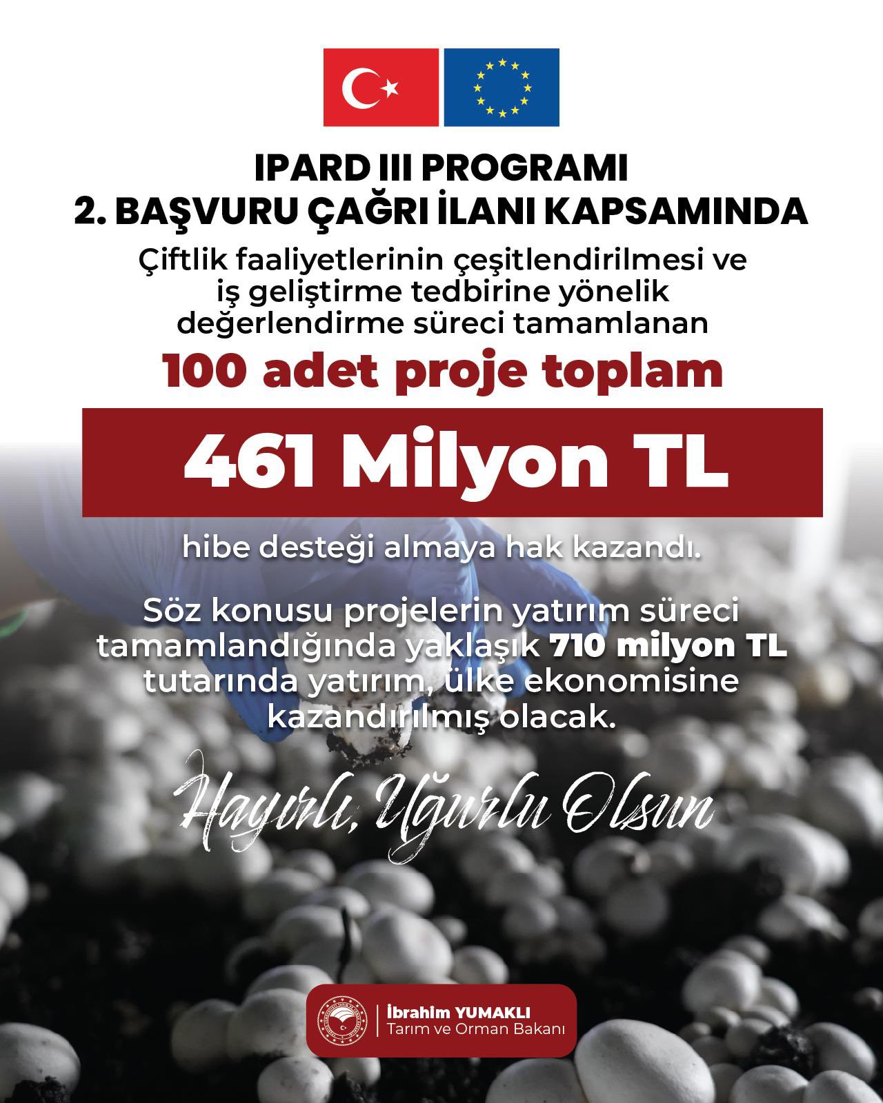 Tarım ve Orman Bakanı İbrahim Yumaklı, "IPARD III Programı" kapsamında onaylanan 100 projeye toplam 461 milyon lira hibe desteği sağlanacağını duyurdu. Bakan Yumaklı, sosyal medya hesabından yaptığı paylaşımda, tarım ve kırsal kalkınma alanında önemli yatırımların destekleneceğini belirtti. Yumaklı, konuya ilişkin açıklamasında şunları aktardı: "IPARD III Programı kapsamında mantar yetiştiriciliği, seracılık, arıcılık ve arı ürünlerinin üretimi, işlenmesi ve pazarlanmasıyla yenilenebilir enerji gibi sektörlerde değerlendirme süreci tamamlanan 100 proje hibe desteği almaya hak kazandı. Toplam 461 milyon lira hibe desteği ödenecek bu projelerin yatırım süreci tamamlandığında ise yaklaşık 710 milyon lira tutarında yatırım ülke ekonomisine kazandırılmış olacak." IPARD III Programı Nedir? IPARD (Avrupa Birliği Katılım Öncesi Kırsal Kalkınma Programı), Türkiye'nin Avrupa Birliği'ne uyum sürecinde kırsal kalkınmayı desteklemek amacıyla uyguladığı bir teşvik programıdır. Tarım ve Kırsal Kalkınmayı Destekleme Kurumu (TKDK) tarafından yürütülen program, tarım sektöründeki modernizasyonu, gıda güvenliğini ve sürdürülebilir kırsal kalkınmayı hedeflemektedir. IPARD III, programın üçüncü aşamasıdır ve önceki IPARD I ve II dönemlerinden elde edilen deneyimlerle daha geniş kapsamlı ve etkin bir şekilde uygulanmaktadır. Program kapsamında tarımsal işletmelerin modernizasyonu, kırsal ekonominin çeşitlendirilmesi ve çevresel sürdürülebilirlik gibi konulara öncelik verilmektedir. Ayrıca, yenilenebilir enerji ve organik tarım gibi alanlara yönelik yatırımları teşvik ederek kırsal bölgelerdeki istihdamı artırmayı amaçlamaktadır. Kaynak: İbrahim Yumaklı - X
