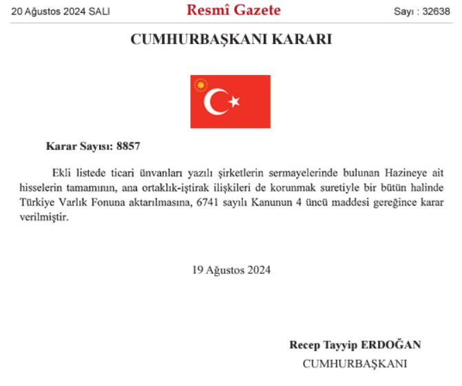 Farklı sektörlerde faaliyet gösteren 12 şirketin sermayesinde bulunan Hazine'ye ait hisselerin tamamı Türkiye Varlık Fonu'na aktarıldı. Cumhurbaşkanı Recep Tayyip Erdoğan'ın imzasıyla Resmi Gazete'de yayımlanan karara göre, ticari ünvanlı şirketlerin sermayelerinde bulunan Hazine’ye ait hisselerin tamamının, ana ortaklık-iştirak ilişkileri de korunmak suretiyle bir bütün halinde Türkiye Varlık Fonu'na aktarılmasına karar verildi. Hazine’ye ait hisseleri Türkiye Varlık Fonuna aktarılan şirketlerin isimleri ise şöyle oldu: Koza-İpek Holding Anonim Şirketi İpek Doğal Enerji Kaynakları Araştırma ve Üretim Anonim Şirketi Koza Anadolu Metal Madencilik İşletmeleri Anonim Şirketi ATP İnşaat ve Ticaret Anonim Şirketi ATP Havacılık Ticaret Anonim Şirketi ATP Koza Turizm Seyahat ve Ticaret Anonim Şirketi REK-TUR Reklam Pazarlama ve Ticaret Limited Şirketi Koza Prodüksiyon ve Ticaret Anonim Şirketi Ipek Online Bilişim Hizmetleri Limited Şirketi Koza Altın İşletmeleri Anonim Şirketi Özdemir Antimuan Madenleri Anonim Şirketi Koza Ipek Tedarik Danışmanlık ve Araç Kiralama Ticaret Anonim Şirketi. Söz konusu karar, 6741 sayılı Türkiye Varlık Fonu Yönetimi Anonim Şirketinin Kurulması ile Bazı Kanunlarda Değişiklik Yapılmasına Dair Kanun'un 4'üncü maddesi gereğince alındı. Kaynak: Resmi Gazete [news_id:728609]