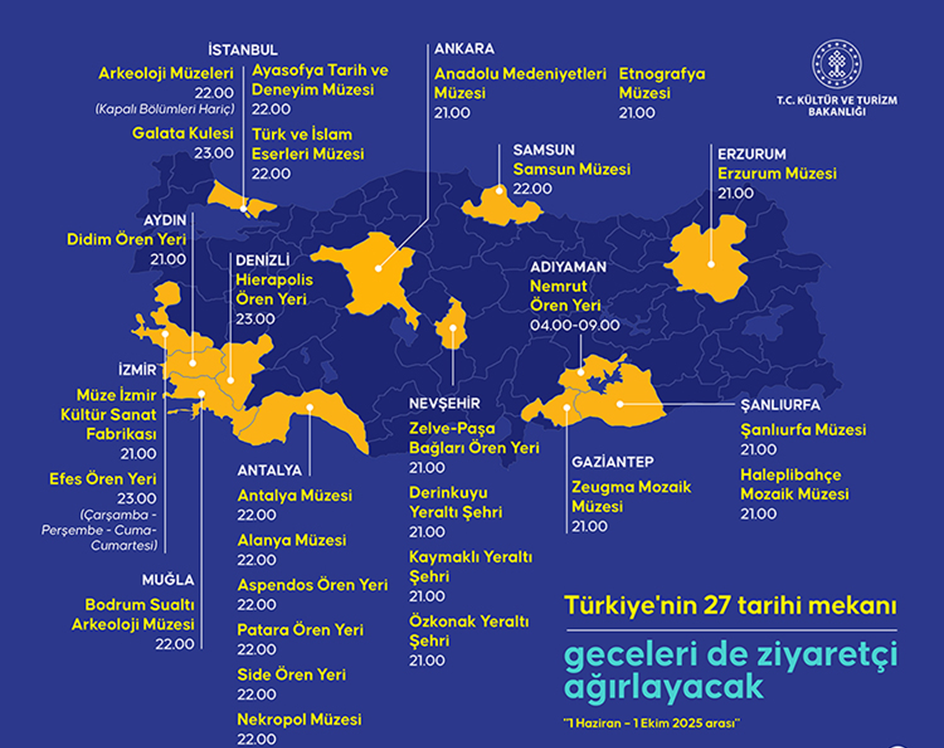 Kültür ve Turizm Bakanlığı’nın yarından itibaren hayata geçireceği gece müzesi uygulamasıyla, Türkiye genelindeki bazı müze ve ören yerleri yaz akşamlarında da ziyarete açılacak. İşte geç saatlerde ziyaret edilebilecek kültür rotaları.. Kültür ve Turizm Bakanlığı’nın geçen yıl başlattığı gece müzeciliği uygulaması ile bu yıl 27 müze ve ören yeri geç saatlere kadar gezilebilecek. Geçen yıl ziyaretçilerin ilgisini çeken gece müzeciliği uygulaması, bu yıl 1 Haziran'da başlayacak ve 1 Ekim tarihine kadar devam edecek. Böylelikle 13 farklı ilde 27 noktada bulunan kültürel miraslar, gece saatlerinde ışıklandırmalar eşliğinde ziyaret edilebilecek. Ziyaret saatleri farklılık gösteriyor Gece müzeciliği kapsamındaki tarihî mekânların ziyaret saatleri ise farklılık gösterecek. Gece müzeciliğinde en çok ilgi çeken ve UNESCO Dünya Miras Listesi'nde yer alan Efes Antik Kenti, bu yıl kapılarını çarşamba, perşembe, cuma ve cumartesi günleri akşam saat 23.00'e kadar açık tutacak. Güneydoğu Anadolu'nun en çok ziyaret edilenleri arasında bulunan Adıyaman Nemrut Ören yeri 04.00-09.00 saatleri arasında ziyaretçilerini ağırlayacak. Galata Kulesi saat 23.00'e kadar açık Türkiye'nin en çok ziyaret edilen tarihi mekanlarından Galata Kulesi ise saat 23.00'e kadar ziyaret edilebilecek. İstanbul Arkeoloji Müzeleri (kapalı alanları hariç), Ayasofya Tarih ve Deneyim Müzesi ve İstanbul Türk ve İslam Eserleri Müzesi de saat 22.00'ye kadar açık olacak. Kaynak: AA [news_id:770587]