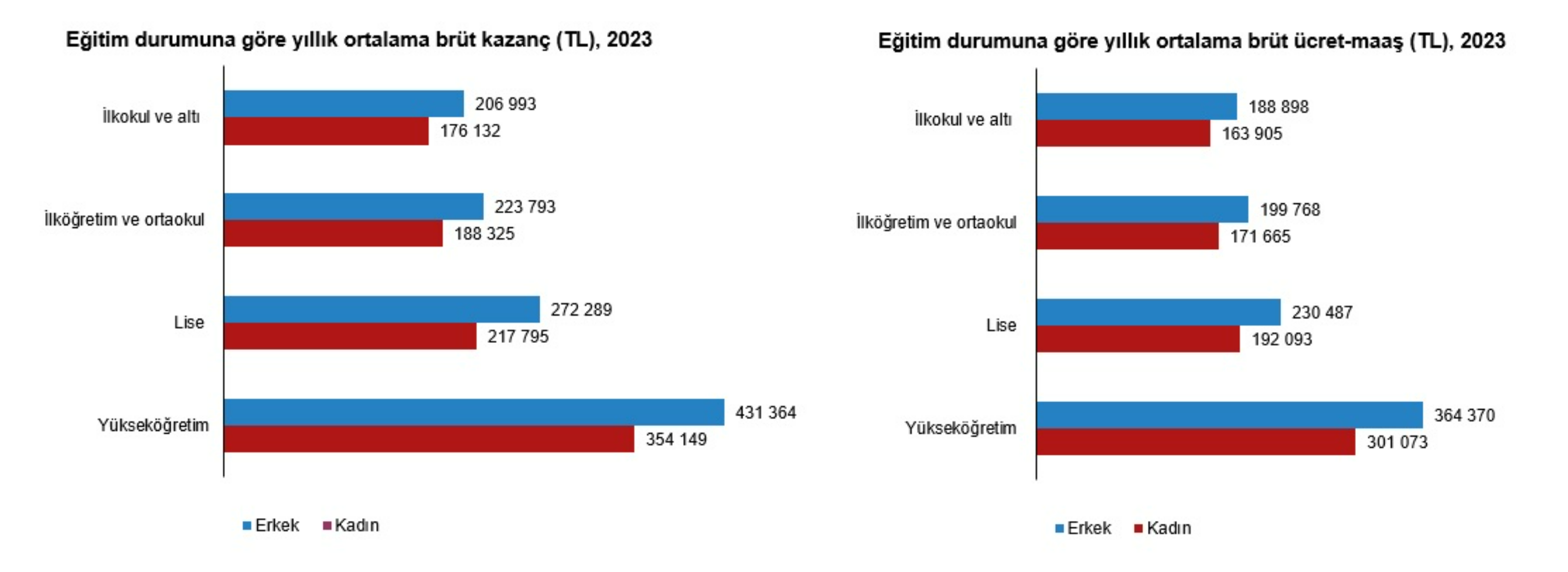TÜİK verilerine göre 2023'te aylık ortalama kişi başı brüt kazanç 26 bin 402 TL oldu. Ücretli çalışan erkekler için aylık ortalama brüt kazanç 26 bin 638 TL olurken, kadınlar için bu değer 25 bin 931 TL seviyesinde gerçekleşti. Türkiye İstatistik Kurumu (TÜİK), 2023 yılı Kazanç Yapısı İstatistikleri’ni paylaştı. Buna göre, çalışmanın referans dönemi olan 2023 Kasım ayında aylık brüt asgari ücret 13 bin 414,5 TL. Kazanç yapısı istatistiklerine göre, aylık ortalama kişi başı brüt ücret-maaş 23 bin 789 TL olarak gerçekleşti. Ücretli çalışan erkekler aylık ortalama 24 bin 11 TL brüt ücret-maaş alırken, kadınlar 23 bin 344 TL brüt ücret-maaş aldı. Aylık ortalama kişi başı brüt kazanç 26 bin 402 TL olarak gerçekleşti. Ücretli çalışan erkekler için aylık ortalama brüt kazanç 26 bin 638 TL olurken, kadınlar için 25 bin 931 TL oldu. Aylık ücretli çalışılan saat 200 olarak gerçekleşti. Erkeklerde aylık ücretli çalışılan saat 205 olarak gerçekleşirken kadınlarda 190 saat olarak gerçekleşti. Saatlik ortalama brüt ücret-maaş 119 TL olarak gerçekleşti. Ücretli çalışan erkekler saatlik ortalama 117 TL brüt ücret-maaş alırken, kadınlar 123 TL brüt ücret-maaş aldı. Yıllık ortalama brüt kazanç 305 bin 784 TL oldu. Bu değer, erkeklerde 314 bin 242 TL ve kadınlarda 289 bin 720 TL oldu. En yüksek kazancı yükseköğretim mezunlarında Kazanç düzeylerinin hem erkeklerde hem de kadınlarda eğitim durumu ile birlikte yükseldiği görüldü. Eğitim durumuna göre en yüksek yıllık ortalama brüt kazancı yükseköğretim eğitim düzeyine sahip olanlar elde etti. Bu eğitim düzeyinde yıllık ortalama brüt kazanç erkeklerde 431 bin 364 TL, kadınlarda ise 354 bin 149 TL oldu. En yüksek yıllık ortalama brüt ücret-maaşı yükseköğretim eğitim düzeyine sahip olanlar elde ederken, bu eğitim düzeyinde erkeklerin brüt ücret-maaşı 364 bin 370 TL, kadınların ise 301 bin 73 TL olarak gerçekleşti. En yüksek kazanç finans ve sigorta sektöründe Ücretli çalışanların brüt kazançları, ekonomik faaliyet ayrımında incelendiğinde, en yüksek yıllık ortalama brüt kazanç 640 bin 739 TL ile finans ve sigorta faaliyetlerinde oldu. Bu ekonomik faaliyeti, 605 bin 317 TL ile bilgi ve iletişim ve 461 bin 514 TL ile kültür, sanat, eğlence, dinlence ve spor faaliyetleri izledi. En düşük yıllık ortalama brüt kazançlar ise sırasıyla 213 bin 518 TL ile konaklama ve yiyecek hizmeti faaliyetleri, 218 bin 815 TL ile gayrimenkul faaliyetleri ve 227 bin 284 TL ile diğer hizmet faaliyetlerinde oldu. Kadın çalışanların yıllık ortalama brüt kazancı, ulaştırma ve depolama faaliyetinde 414 bin 502 TL, elektrik, gaz, buhar ve iklimlendirme üretimi ve dağıtımı faaliyetinde 453 bin 413 TL ile bu sektörlerdeki erkek çalışanların yıllık ortalama brüt kazancının üzerinde gerçekleşti. En yüksek yıllık ortalama brüt kazancı 538 bin 530 TL ile yöneticiler meslek grubunda çalışanlar elde etti. Bu meslek grubunu 409 bin 767 TL ile profesyonel meslek mensupları izledi. En düşük yıllık ortalama brüt kazanç ise 202 bin 809 TL ile nitelikli tarım, ormancılık ve su ürünleri çalışanları grubunda gerçekleşti. Kadın-erkek arası kazanç farkı Yıllık ortalama brüt kazanç ile hesaplanan gösterge için en yüksek fark yüzde 20,0 ile lise mezunlarında, en düşük fark ise yüzde 14,9 ile ilkokul ve altı mezunlarda gerçekleşti. Yıllık ortalama brüt ücret-maaş ile hesaplanan gösterge için ise en yüksek fark yüzde 17,4 ile yükseköğretim mezunlarında, en düşük fark yüzde 13,2 ile yine ilkokul ve altı mezunlarda gerçekleşti. Kadın-erkek arası kazanç farkının en yüksek olduğu meslek grupları; yüzde 23,5 ile sanatkârlar ve ilgili işlerde çalışanlar ve yüzde 22,9 ile teknisyenler, teknikerler ve yardımcı profesyonel meslek mensupları olmuştur. En düşük olduğu meslek grupları ise yüzde 2,0 ile yöneticiler ve yüzde 7,2 ile hizmet ve satış elemanları. Kadın-erkek arası ücret farkının en yüksek olduğu meslek grupları; yüzde 21,1 ile profesyonel meslek mensupları, yüzde 20,3 ile tesis ve makine operatörleri ve montajcılar ve aynı oran ile sanatkârlar ve ilgili işlerde çalışanlar olmuştur. En düşük olduğu meslek grupları ise yüzde 1,8 ile yöneticiler ve yüzde 6,4 ile nitelik gerektirmeyen meslekler. Kaynak: TÜİK