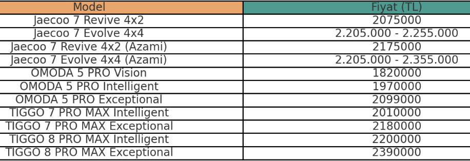 Yeni yılın başlamasıyla birlikte otomotiv markaları fiyatlarını güncelledi. Türkiye’de özellikle SUV segmentinde büyük ilgi gören Jaecoo ve Chery, Şubat 2025 itibarıyla geçerli olacak güncel fiyat listesini duyurdu. Jaecoo 7 Şubat 2025 Fiyat Listesi Revive 4x2: 2.075.000 TL Evolve 4x4: 2.205.000 TL - 2.255.000 TL Jaecoo 7 2025 Model Yılı Azami Anahtar Teslim Satış Fiyatı Revive 4x2: 2.175.000 TL Evolve 4x4: 2.205.000 TL - 2.355.000 TL Chery OMODA 5 PRO Şubat 2025 Fiyat Listesi Vision: 1.820.000 TL Intelligent: 1.970.000 TL Exceptional: 2.099.000 TL Chery TİGGO 7 PRO MAX Şubat 2025 Fiyat Listesi Intelligent: 2.010.000 TL Exceptional: 2.180.000 TL Chery TİGGO 8 PRO MAX Şubat 2025 Fiyat Listesi Intelligent: 2.200.000 TL Exceptional: 2.390.000 TL Döviz kuru dalgalanmaları ve vergi düzenlemeleri, araç fiyatlarının belirlenmesinde kritik rol oynuyor. Chery ve Jaecoo’nun SUV segmentinde sunduğu rekabetçi fiyatlandırma, markaları Türkiye pazarında cazip hale getirdi. SUV Modellerinde Teknik Özellikler ve Donanım Seviyeleri Jaecoo 7, yüksek performansı ve rekabetçi fiyatıyla dikkat çeken bir SUV modeli olarak öne çıktı. 145 beygir gücü ve 290Nm maksimum tork üretme kapasitesine sahip olan model, 1.6TGDI motor ve 7DCT ıslak çift kavramalı şanzıman ile donatıldı. 4x4 ve 4x2 modelleri farklı iç donanımlara ve yakıt tüketimine sahip olarak satışa sunuldu. Jaecoo 7'nin 4x2 modelinde ortalama yakıt tüketimi 7,5 litre, 4x4 modelinde ise 8 litre olarak açıklandı. Araç, her zemine uygun akıllı sürüş sistemi ARDIS ile sürüş konforunu önemli ölçüde artırdı. Chery’nin SUV modelleri ise geniş iç hacmi, gelişmiş donanım özellikleri ve güvenlik sistemleri ile tüketicilerin beğenisini kazandı. OMODA 5 PRO, TİGGO 7 PRO MAX ve TİGGO 8 PRO MAX modelleri, sundukları fiyat-performans dengesiyle dikkat çekti. Jaecoo 7 ve Chery SUV İç Donanım Özellikleri Jaecoo 7'nin her iki modelinde de standart olarak 10.25 inç dijital gösterge paneli bulunuyor. Multimedya ekran boyutları donanım seviyesine göre 13.2 inç ve 14.8 inç olarak değişiklik gösteriyor. Standart donanımda akıllı sesli komut sistemi, kablosuz Apple CarPlay, Android Auto ve kablosuz cep telefonu şarj ünitesi yer alıyor. Üst donanım seviyesinde ise head-up display ve Sony ses sistemi iç donanıma dahil ediliyor.