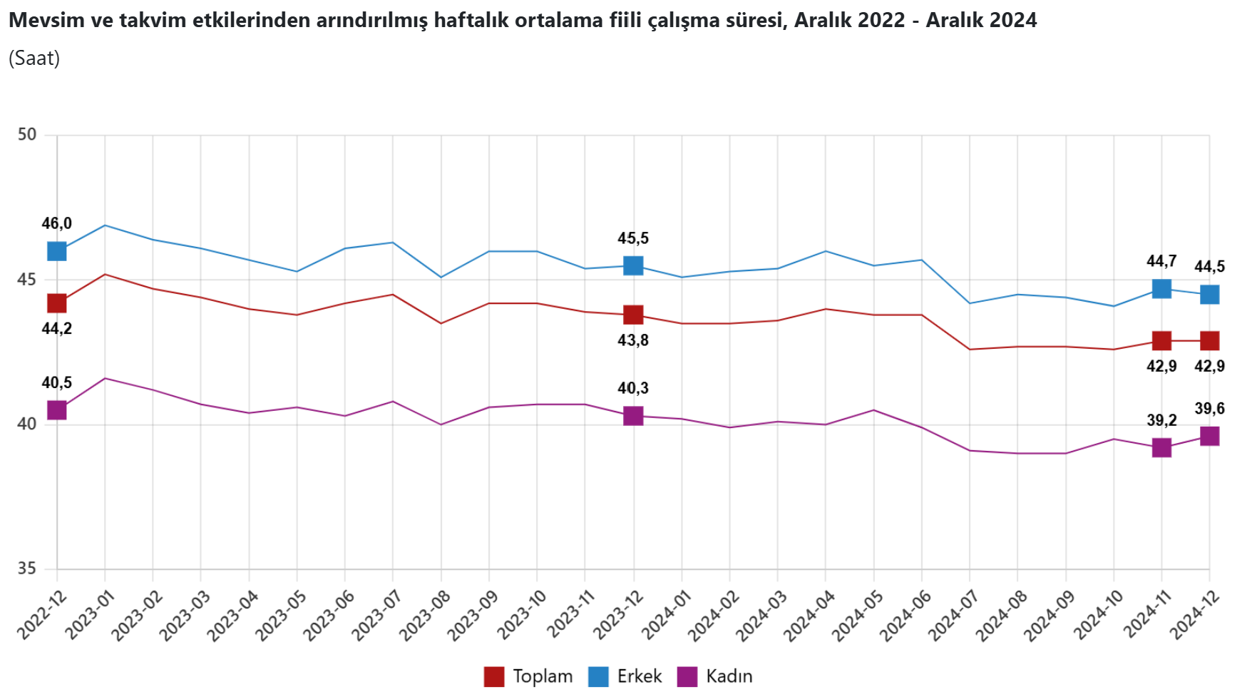 Türkiye İstatistik Kurumu (TÜİK), 2024 yılına ilişkin işsizlik rakamlarını açıkladı. TÜK'in Hanehalkı İşgücü Araştırması sonuçlarına göre 15 ve daha yukarı yaştaki kişilerde işsiz sayısı 2024 yılı Aralık ayında bir önceki aya göre 39 bin kişi azalarak 3 milyon 26 bin kişi oldu. İşsizlik oranı ise 0,1 puan azalarak %8,5 seviyesinde gerçekleşti. İşsizlik oranı erkeklerde %6,9 iken kadınlarda %11,4 olarak tahmin edildi. Kaynak: TÜİK Mevsim etkisinden arındırılmış istihdam %49,5 oldu İstihdam edilenlerin sayısı 2024 yılı Aralık ayında bir önceki aya göre 54 bin kişi azalarak 32 milyon 718 bin kişi, istihdam oranı ise 0,1 puan azalarak %49,5 oldu. Bu oran erkeklerde %66,9 iken kadınlarda %32,4 olarak gerçekleşti. Mevsim etkisinden arındırılmış işgücüne katılma oranı %54,1 olarak gerçekleşti İşgücü 2024 yılı Aralık ayında bir önceki aya göre 94 bin kişi azalarak 35 milyon 743 bin kişi, işgücüne katılma oranı ise 0,1 puan azalarak %54,1 olarak gerçekleşti. İşgücüne katılma oranı erkeklerde %71,9 iken kadınlarda %36,6 oldu. Genç nüfusta mevsim etkisinden arındırılmış işsizlik oranı %16,3 oldu 15-24 yaş grubunu kapsayan genç nüfusta işsizlik oranı bir önceki aya göre 0,5 puan artarak %16,3 oldu. Bu yaş grubunda işsizlik oranı; erkeklerde %13,1, kadınlarda ise %22,1 olarak tahmin edildi. Haftalık ortalama fiili çalışma süresi 42,9 saat oldu İstihdam edilenlerden referans döneminde işbaşında olanların, mevsim ve takvim etkilerinden arındırılmış haftalık ortalama fiili çalışma süresi 2024 yılı Aralık ayında bir önceki aya göre değişim göstermeyerek 42,9 saat olarak gerçekleşti. Kaynak: TÜİK Mevsim etkisinden arındırılmış atıl işgücü oranı %28,2 oldu Zamana bağlı eksik istihdam, potansiyel işgücü ve işsizlerden oluşan atıl işgücü oranı 2024 yılı Aralık ayında bir önceki aya göre değişim göstermeyerek %28,2 oldu. Zamana bağlı eksik istihdam ve işsizlerin bütünleşik oranı %18,4 iken işsiz ve potansiyel işgücünün bütünleşik oranı %19,5 olarak tahmin edildi. [news_id:761548]