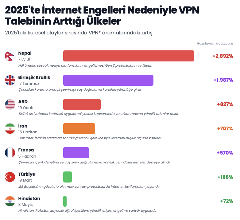 2025’te farklı ülkelerde internet erişimi kısıtlanınca, kullanıcıların VPN arayışları rekor seviyelere çıktı. Yasakların gerekçeleri ülkelere göre değişti ama sonuç hep aynıydı: talep patlaması. Listenin başındaki Nepal’de Facebook, WhatsApp, X ve Instagram gibi platformlar kapatıldı. Hükümet, şirketlerin yerel kayda girmesi için tanıdığı sürenin bitmesiyle engeli devreye aldı. Adım hem diasporayla iletişimi kesti hem de gençlerin öfkesini artırırken ülkede tam bir kaos hakim oldu. VPN aramaları ise neredeyse %3.000’e fırladı. Birleşik Krallık ve Fransa: Yaş doğrulama kuralları Birleşik Krallık’ta 25 Temmuz’da Online Safety Act kapsamında yaş doğrulama şartı getirildi. VPN kullanımı birkaç gün içinde %1.987 artış kaydetti. Fransa’da ise 4 Haziran’da yetişkin sitelerine erişimde benzer doğrulama kuralı yürürlüğe girdi, VPN talebi %570 ile zirveye çıktı. ABD: TikTok yasağı ABD’de 19 Ocak’ta TikTok’un hükümet yasağına yanıt olarak sunucularını kapatmasıyla kullanıcılar hesaplarına erişemedi. VPN aramaları tek günde %827 arttı. Kullanıcılar sosyal medyada VPN’lerle yasağı aşmanın zorluğundan söz etti. İran, Türkiye ve Hindistan: Siyasi gerilim ve yasaklar İran’da protestolar sırasında getirilen internet kısıtlamaları VPN aramalarını %707’e taşıdı. Türkiye’de ise bildiğimiz gibi, Ekrem İmamoğlu’nun gözaltına alınma süreciyle birlikte 19 Mart’ta X, YouTube, Instagram ve TikTok erişime kapatıldı, talep %188 yükseldi. Hindistan’da 8 Mayıs’ta Pakistan kaynaklı içerikler yasaklandı, VPN aramaları %72 arttı.