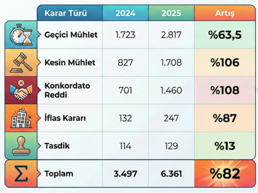 Yüksek faiz ortamının yarattığı ekonomik durgunluk geçtiğimiz yıl konkordato sayısında önemli bir artış yaşanmasına yol açtı. 2025 genelindeki konkordato sayısı son üç yılın toplamını geride bıraktı. 2025 yılında uygulanan sıkı para politikasının etkisiyle konkordato ilanı sayısı 2019'dan bu yana en yüksek seviyeye ulaştı. Geçtiğimiz yıl şirketlere verilen kesin mühlet kararı 2024'e göre yüzde 106 artarken, geçici mühlet kararı alan firma sayısı yüzde 63 yükseldi. Bu dönemde iflas eden firma sayısı ise yüzde 87 artışla 247 oldu. En kırılgan ve en dirençli sektörler 2025 yılında tekstil sektörü, artan enerji ve işçilik maliyetleri, daralan Avrupa pazarı ve kur baskısı nedeniyle en kırılgan sektör olarak öne çıktı. 2025’in en fazla konkordato başvurusu olan sektörlerin zirvesinde tekstil ve hazır giyim, ikinci sırada inşaat, üçüncü sırada metal ürün imalatı, dördüncü sırada sebze ve meyve toptancıları, beşinci sırada gıda sektörü yer aldı. İlgili dönemde en az konkordato görülen sektörler ise tarım ve hayvancılığa dayalı küçük ölçekli işletmeler, yerel hizmet sektörleri ve kamuya bağımlı çalışan mikro işletmeler oldu. Bu sektörlerde düşük borçlanma oranı ve nakit döngüsünün kısa olması koruyucu etki yarattı. TCMB’den konkordato analizi TCMB blog sayfası Merkezin Güncesi'nde yayımlanan "Konkordato Gelişmelerine Yakından Bir Bakış" başlıklı analizde ise konkordato taleplerinin parasal sıkılaştırma öncesinde de riskli kategoride sayılabilecek ve ekonomideki ağırlığı görece düşük firmalarda yoğunlaştığı değerlendirilmişti. Konkordato öncesinde firmaların müşteri ve tedarikçi sayısının azaldığının, konkordato sonrasında ise yatay seyrettiğinin görüldüğü aktarılan analizde, şunlar paylaşılmıştı: "Konkordato öncesinde tedarikçi sayısındaki azalış nakit akışı ve borç yönetiminde yaşanan sorunların diğer firmalar tarafından da hissedildiğini gösteriyor. Bu durum, konkordato firmalarının ticari ilişkilerinin süreç öncesinde zayıfladığını ancak ilgili kanunda da öngörüldüğü gibi konkordato sonrasında firmaların faaliyetlerine devam edebildiğini gösteriyor." Kaynak: Merkez'in Güncesi [news_id:785160]