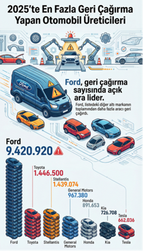 2025 yılında çok sayıda otomobil şirketi araçlarını yazılım, kamera ve ayna hatalarını gerekçe göstererek geri çağırdı. İşte 2025 yılında en çok geri çağırma yapan otomobil üreticileri.. BizzyCar, 2025 yılının üçüncü çeyrek dönemine ilişkin geri çağırma raporunu yayımladı. Otomotiv endüstrisinin karşı karşıya olduğu devam eden güvenlik sorunlarına kapsamlı bir bakış sunan rapora göre yılbaşından bu yana küresel geri çağırma kararları yaklaşık 19,3 milyon aracı etkiledi. En yaygın geri çağırma sebepleri Geri çağırma sebepleri incelendiğinde ise geri dönüş ve elektrik sisteminde yaşanan sorunlar zirvede yer aldı. Benzinli yakıt sistemlerinde oluşan sorunların üçüncü sırada yer aldığı geri çağırma sebepleri arasında, hidrolik sistemdeki sorunlar dördüncü sıraya yerleşti. En fazla geri çağırma kararı alan üreticiler Küresel çapta 2025 yılının en fazla geri çağırma kararı alan otomobil üreticileri ise şunlar oldu: Tesla: Tesla, neredeyse tüm Cybertruck'lar dahil olmak üzere 2025'in ilk üç çeyreğinde 662 bin 036 aracını geri çağırdı. Kia: Kia, 2025'in ilk üç çeyreğinde 726 bin 708 aracını geri çağırdı. Bu grup içerisinde ne büyük payı 250 binden fazla yakıt deposu arızası bildiren K5 aldı. Honda: Honda, 2025 yılının ilk üç çeyreğinde 891 bin 653 aracını geri çağırdı. Geri çağrılan araçlar arasında, 2023-2025 yılları arasında üretilen ve kazalara yol açabilecek bir yazılım hatası bulunan 250 binden fazla Accord Hybrid yer aldı. General Motors: General Motors ise 2025’in ilk üç çeyreğinde 967 bin 380 aracını geri çağırdı. Geri çağırmalar arasında Cadillac Escalade’ler; Chevrolet Silverado, Suburban ve Tahoe modelleri ve GMC Sierra ile Yukon modelleri bulundu. Stellantis: Stellantis, 2025'in ilk üç çeyreğinde 1 milyon 439 bin 074 aracı geri çağırdı. Geri çağırmalar arasında Jeep Wranglers ve Chrysler Pacificas önemli bir payı aldı. Toyota: Toyota da 2025'in ilk üç çeyreğinde 1 milyon 446 bin 500 aracı geri çağırarak bu alanda ikinci sıraya yerleşti. Geri çağırmaların çoğu, aralarında Lexus'un da olduğu yedek park yardım kameralarını içeren bir yazılım sorunundan kaynaklandı. Ford: Ford, listedeki diğer tüm markaların toplamından daha fazla geri çağırma vakası bildirdi ve 2025 yılının ilk üç çeyreğinde 9 milyon 420 bin 920 araçta sorun tespit etti. Geri çağırmalar, araçların kendiliğinden hareket etme riskini, geri görüş kamerasını ve dikiz aynası sorunlarını kapsıyordu. [news_id:790252] [news_id:761903]