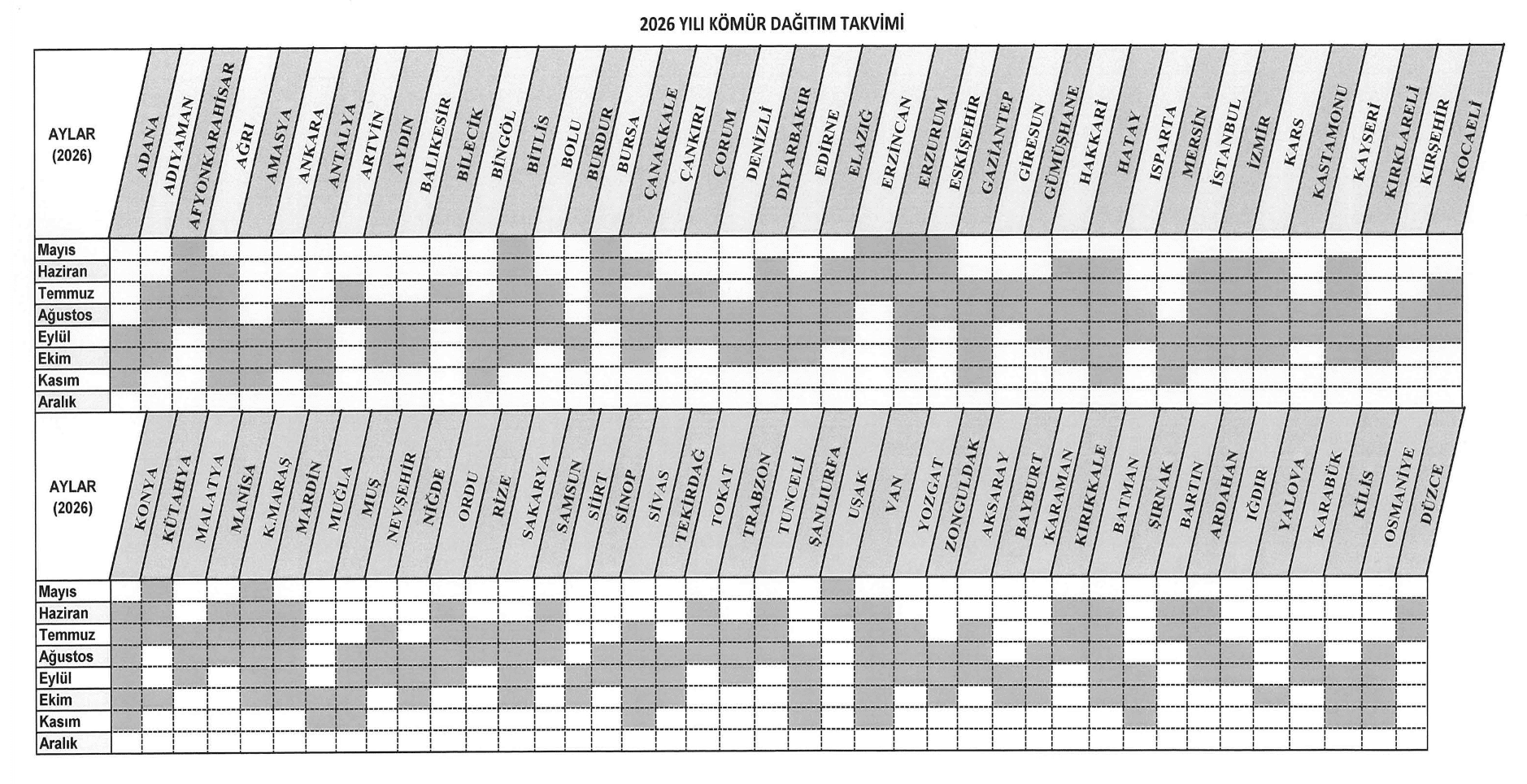 Cumhurbaşkanı Recep Tayyip Erdoğan imzasıyla bugün Resmî Gazete’de yayımlanan kararla, 2026 yılı için ihtiyaç sahibi hanelere ısınma amaçlı kömür yardımı yapılması resmileşti. Karar, 1 Ocak 2026’dan itibaren geçerli olmak üzere yürürlüğe girdi. Sosyal devlet ilkesi gereği yapılacak yardımlarda, kömürün madenden çıkıp soba yanana kadar geçireceği tüm serüven, sorumlular ve kurallar en ince ayrıntısına kadar belirlendi. İşte kararın satır aralarındaki önemli detaylar: Hangi Ailelerin Alacağı Yıl İçinde Değişebilir Yardımdan faydalanacak aileleri, il ve ilçelerdeki Sosyal Yardımlaşma ve Dayanışma Vakıfları belirlemeye devam edecek. Ancak süreç statik değil; dinamik işleyecek. Listeler Güncellenebilir: Vakıflar, yıl içerisinde ihtiyaç sahibi hane sayısında bir değişiklik olduğunu (artış veya azalış) tespit ederse, bu durumu Aile ve Sosyal Hizmetler Bakanlığı'na bildirerek listelerde güncelleme talep edebilecek. Kömür Miktarı "İklime Göre" Ayarlanacak Her şehre veya ilçeye aynı torba kömür gitmeyecek. Dağıtılacak miktar belirlenirken o bölgenin iklim koşulları (kışın sertliği), geçmiş yıllardaki tüketim verileri ve kömürün ısıl değeri (kalorisi) hesaplamaya katılacak. Miktar Değişikliği Yetkisi: Eğer bir vakıf, bölgesindeki hane başı kömür miktarının yetersiz veya fazla olduğunu düşünürse, miktar değişikliği talebini Aile Bakanlığı'na değil, Hazine ve Maliye Bakanlığı'na iletecek. Son kararı Hazine verecek. Tedarik Süreci: Sigortalı ve "En Uygun Maliyetle" Kömürü temin edecek olan TKİ ve TTK, kömürü öncelikle kendi sahalarından çıkaracak. Ancak talep çok olursa veya gerekirse, kendilerine bağlı iştirak ve ortaklıkların sahalarından da kömür temin edebilecekler. Maliyet Tedbiri: Kurumlara, devlet zarara uğramasın diye "görevlendirme bedelini asgari düzeyde tutacak tedbirleri alma" zorunluluğu getirildi. Teslimat Şartı (CIF): Kömür vakıflara teslim edilene kadar tüm sorumluluk devletin kurumlarında. Fiyatlandırma "CIF Satış Esası"na göre yapılacak; yani kömürün bedeline nakliye ve sigorta masrafları da dahil edilerek işlem yapılacak. Sevkiyat ve Gecikme Durumu Kömür taşımacılığında TCDD (Demiryolları) başrol oynayacak ve bu sevkiyata trafikte "öncelik" tanıyacak. Takvim Esnekliği: Sevkiyatlar önceden belirlenen bir takvime göre yapılacak. Ancak olağanüstü bir durum olur ve takvime uyulamazsa, vakıflar mağdur edilmeyecek; TKİ ve TTK imkanları dahilinde hemen yeni bir sevkiyat programı hazırlayarak açığı kapatacak. Sıkı Denetim: İçişleri Bakanlığı Devrede Sürecin suistimal edilmemesi için çok yönlü bir denetim mekanizması kuruldu. Çifte Denetim: Kömür dağıtımını yapan yerel vakıflar, sadece Aile ve Sosyal Hizmetler Bakanlığı tarafından değil, aynı zamanda İçişleri Bakanlığı tarafından da denetlenebilecek. Haksız Kullanım: Kömürü aldığı halde satan ya da amacı dışında kullanan ailenin tespiti halinde, o ailenin durumu vakıf tarafından tekrar gözden geçirilecek ve yardım kesilebilecek. Vergi ve Fatura Detayı Vatandaşın veya vakıfların herhangi bir vergi ödemesi söz konusu değil. KDV Dahil: Kömürden doğan tüm vergiler ve harçlar (KDV dahil) TKİ ve TTK tarafından ödenecek. Fatura Kime Kesilecek?: Kömür vatandaşa ücretsiz verilecek ancak resmiyette bir fatura olmak zorunda. Bu faturalar, kömürü teslim alan ailenin bulunduğu ilçedeki Sosyal Yardımlaşma ve Dayanışma Vakfı adına düzenlenecek. Çevre Hassasiyeti Hava kirliliğini önlemek adına dağıtılacak kömürün kalitesi, Çevre Mevzuatı'ndaki (Isınmadan Kaynaklanan Hava Kirliliğinin Kontrolü Yönetmeliği) kriterlere birebir uymak zorunda. Kalitesiz kömür dağıtımına izin verilmeyecek. Kararın uygulanmasına ilişkin diğer teknik usul ve esaslar, Hazine ve Maliye Bakanlığı tarafından, Enerji ve Aile Bakanlıklarının görüşü alınarak ayrıca belirlenecek. Adana Mayıs, Temmuz, Ağustos, Eylül Adıyaman Mayıs Afyonkarahisar Mayıs, Haziran, Temmuz, Ağustos, Eylül, Ekim Ağrı Haziran, Ağustos, Ekim Amasya Mayıs, Haziran, Temmuz, Ağustos, Eylül, Ekim Ankara Haziran, Temmuz, Ağustos, Eylül, Ekim Antalya Mayıs, Haziran, Temmuz, Ağustos, Eylül, Ekim Artvin Mayıs, Temmuz, Ağustos, Eylül, Ekim Aydın Mayıs, Haziran, Temmuz, Ağustos, Eylül, Ekim Balıkesir Mayıs, Haziran, Temmuz, Ağustos, Eylül, Ekim Bilecik Haziran, Ağustos, Ekim Bingöl Mayıs, Haziran, Temmuz, Ağustos, Eylül, Ekim Bitlis Haziran, Temmuz, Eylül, Ekim Bolu Mayıs, Haziran, Temmuz, Ağustos, Eylül, Ekim Burdur Mayıs Bursa Mayıs, Haziran, Temmuz, Ağustos, Eylül, Ekim Çanakkale Haziran, Temmuz, Ağustos, Eylül, Ekim Çankırı Temmuz, Ağustos, Ekim Çorum Mayıs, Haziran, Temmuz, Ağustos, Eylül, Ekim Denizli Mayıs, Haziran, Temmuz, Ağustos, Eylül, Ekim Diyarbakır Mayıs, Haziran, Temmuz, Ağustos, Eylül, Ekim Edirne Haziran Elazığ Mayıs, Haziran, Temmuz, Ağustos, Eylül, Ekim Erzincan Mayıs, Temmuz, Eylül Erzurum Mayıs, Haziran, Temmuz, Ağustos, Eylül, Ekim Eskişehir Mayıs, Haziran, Ağustos, Eylül Gaziantep Mayıs, Haziran, Temmuz, Ağustos, Eylül, Ekim Giresun Mayıs, Haziran, Temmuz, Ağustos, Eylül, Ekim Gümüşhane Mayıs, Temmuz, Ağustos, Eylül, Ekim Hatay Mayıs, Haziran, Temmuz, Ağustos, Eylül, Ekim Isparta Mayıs, Haziran, Temmuz, Ağustos, Eylül, Ekim İstanbul Mayıs, Haziran, Temmuz, Ağustos, Eylül İzmir Mayıs, Haziran, Temmuz, Ağustos, Eylül Kars Mayıs, Haziran, Temmuz, Ağustos Kastamonu Mayıs, Haziran, Temmuz Kayseri Mayıs, Haziran, Temmuz Kırklareli Mayıs, Haziran Kocaeli Mayıs Konya Mayıs, Haziran, Temmuz, Ağustos, Eylül, Ekim Kütahya Mayıs, Haziran, Temmuz, Ağustos, Eylül, Ekim Malatya Mayıs, Temmuz, Ağustos, Eylül, Ekim Manisa Mayıs, Haziran, Temmuz, Ağustos, Eyl