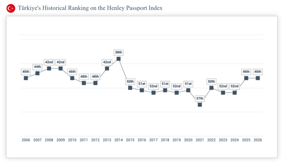 Pasaportların gücünü vizesiz seyahat edebildikleri ülkelere göre ölçen Henley Pasaport Endeksi’nin 2026 yılına ilişkin sonuçları açıklandı. Peki, Türk pasaportu kaçıncı sırada yer aldı? İşte detaylar.. Henley & Partners tarafından Uluslararası Hava Taşımacılığı Birliği’nin (IATA) resmi verilerinden faydanılarak hazırlanan Henley Pasaport Endeksi sonuçları açıklandı. Güncel rapora göre dünyanın en güçlü pasaportları yine Asya ülkelerinden çıktı. Singapur pasaportu, 227 ülke ve bölgenin 192’sine vizesiz giriş hakkı tanıyarak listenin ilk sırasında yer aldı. Japonya ve Güney Kore ise 188 destinasyonla ikinci sırayı paylaştı. Listenin üçüncü sırasında da 186 destinasyonla Danimarka, Lüksemburg, İspanya, İsveç ve İsviçre yer aldı. Türk pasaportunun sırası değişmedi Türkiye ise geçen yıl olduğu gibi Rusya ile birlikte en güçlü 46’ıncı pasaporta sahip ülke oldu. Türkiye ve Rusya’nın 113 ülkeye vizesiz seyahat imkanı sağladığı görüldü. Geçtiğimiz yıl vizesiz seyahat edilebilen destinasyon sayısı 116’ydı. Türkiye geçen seneki yerini korurken 2024'te 52. sırada yer almıştı. Listede Türkiye'nin bulunduğu en yüksek konum ise 2014 yılında 38. sıra olmuştu. [news_id:796274]