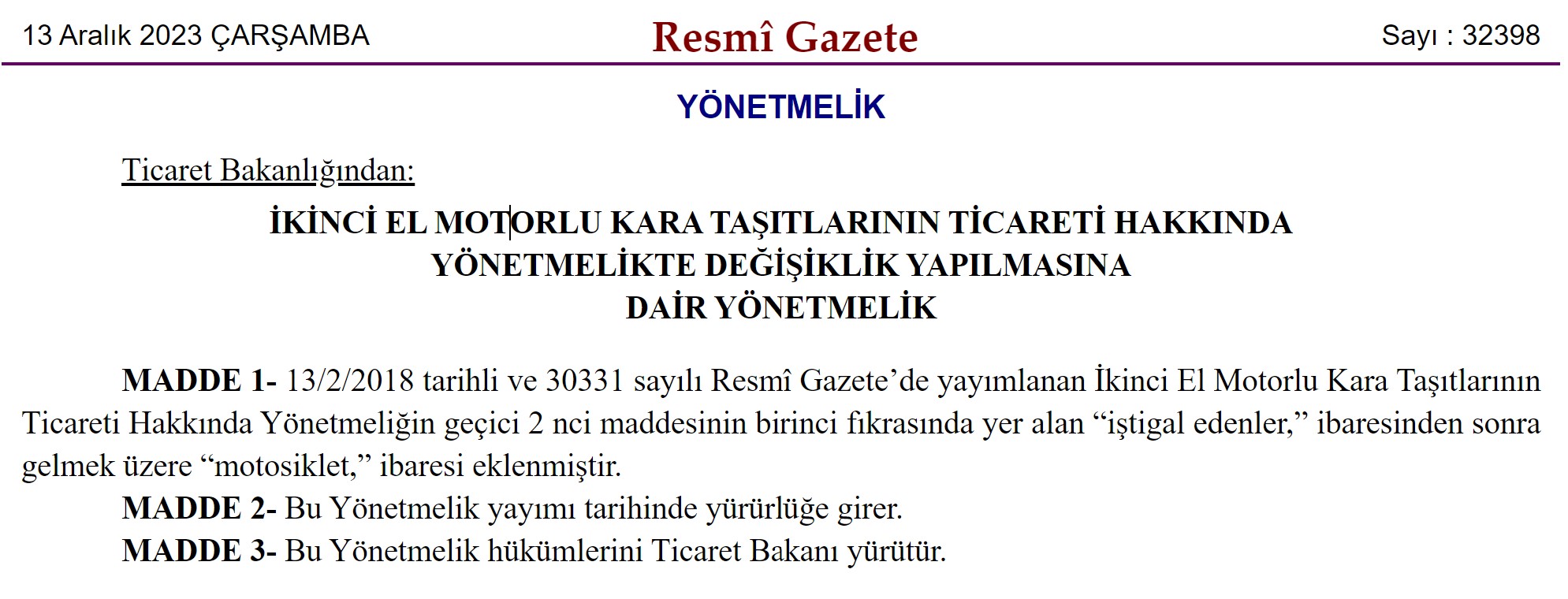 İkinci el araç satışında uygulanan "6 ay ve 6 bin kilometre" kuralına motosiklet de dahil edildi. Ticaret Bakanlığı'nın ikinci el motosiklet satışlarıyla ilgili yönetmelik değişikliği, Resmi Gazete'de yayımlandı. Değişikliğe gidilen yeni yönetmeliğe göre ikinci el araç satışında uygulanan "6 ay ve 6 bin kilometre" kuralına motosiklet de dahil edildi. Ticaret Bakanlığı'nın yönetmeliğinde, "13/2/2018 tarihli ve 30331 sayılı Resmî Gazete’de yayımlanan İkinci El Motorlu Kara Taşıtlarının Ticareti Hakkında Yönetmeliğin geçici 2'nci maddesinin birinci fıkrasında yer alan 'iştigal edenler' ibaresinden sonra gelmek üzere 'motosiklet' ibaresi eklenmiştir" denildi. Yönetmelik, Resmi Gazete'de yayımlanmasıyla yürürlüğe girdi. Kaynak: Resmi Gazete [news_id:717229]