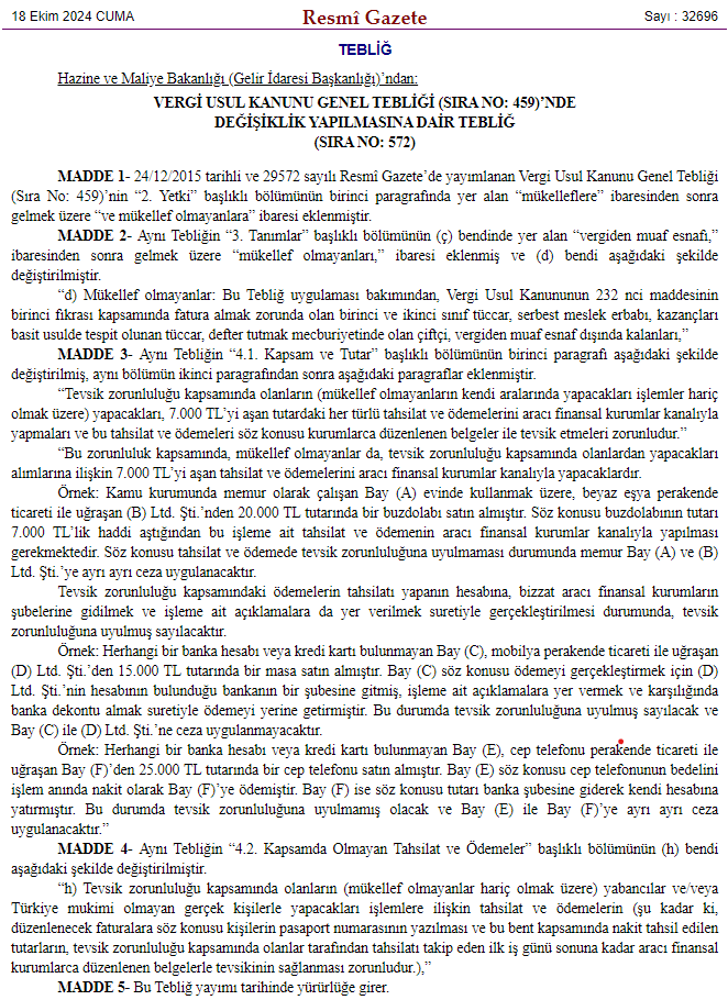 Alışverişlerde 7 bin TL ve üzeri harcamaların banka ve kredi kartı ile yapılması zorunlu hale geldi. Karar, Resmî Gazete’de yayımlanarak yürürlüğe girdi. Hazine ve Maliye Bakanlığı’nın 7 bin TL ve üzeri alışverişlerde ödemelerin yalnızca banka veya kredi kartı ile yapılmasını zorunlu hale getiren tebliği Resmi Gazete’de yayımlandı. Teblige göre mükellef olmayanlar da tevsik zorunluluğu kapsamında olanlardan yapacakları alımlarına ilişkin 7 bin lirayı aşan tahsilat ve ödemelerini aracı finansal kurumlar kanalıyla yapacak. Tevsik zorunluluğuna uymayan taraflara ayrı ayrı ceza uygulanacak. 7 bin liranın üzerindeki tahsilat ve ödemelerin, tahsilatı yapanın hesabına, bizzat aracı finansal kurumların şubelerine gidilerek ve işleme ait açıklamalara da yer verilerek gerçekleştirilmesi durumunda tevsik zorunluluğuna uyulmuş sayılacak. Herhangi bir banka hesabı veya kredi kartı bulunmayan bir kişinin satın aldığı mal veya hizmetin bedelini satıcının hesabının bulunduğu bankanın bir şubesine giderek, işleme ait açıklamalara yer vermek ve karşılığında banka dekontu almak suretiyle ödemeyi yerine getirmesi durumunda tevsik zorunluluğuna uyulmuş sayılacak ve ceza uygulanmayacak. Tevsik zorunluluğuna uymayan taraflara ayrı ayrı ceza uygulanacak Herhangi bir banka hesabı veya kredi kartı bulunmayan bir kişi 7 bin liranın üzerinde ürün satın alması durumunda, satıcı bu parayı elden alıp daha sonra kendi banka hesabına yatırırsa, bu durumda tevsik zorunluluğuna uyulmamış sayılacak ve hem alıcıya hem de satıcıya ayrı ayrı ceza uygulanacak. Kaynak: Resmi Gazete