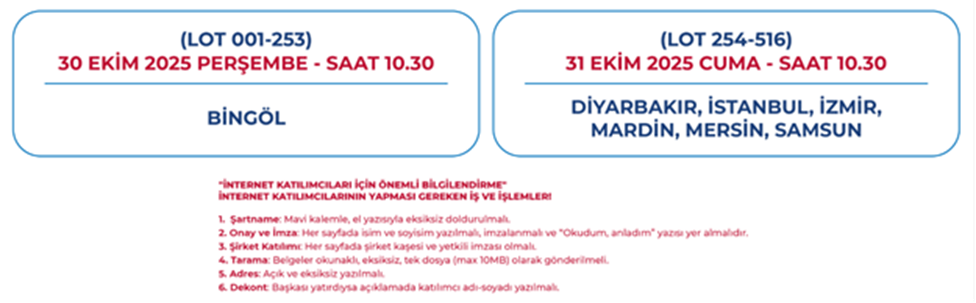 Çevre, Şehircilik ve İklim Değişikliği Bakanlığı Kentsel Dönüşüm Başkanlığı 7 ildeki 319 konut ve 197 iş yerini satışa çıkardığını açıkladı. Çevre, Şehircilik ve İklim Değişikliği Bakanlığı’na bağlı Kentsel Dönüşüm Başkanlığı, Türkiye genelinde gayrimenkul satışına hazırlanıyor. 7 ilde bulunan 319 farklı konut ve 197 iş yeri müzayede yöntemiyle yatırımcılara sunulacak. Konut ve iş yerlerine sahip olmak isteyen kişiler yüzde 25 peşinat verdikten sonra kalan tutarı 60 ay vadede ödeyebilecek. Peşin alımlarda ise ilgili gayrimenkul bedeline yüzde 20 indirim yapılacak. Açık artırma tarihleri Açık artırmalar 30-31 Ekim tarihlerinde saat 10.30'da Ankara İlbank Sosyal Tesisleri, İstanbul TOKİ Hizmet Binası, Bingöl Belediyesi Konferans Salonu ve Mardin Yay Grand Otel’de yapılacak. İnternet üzerinden de teklif verilebilecek olan açık artırma toplantısına katılacak gerçek veya tüzel kişilerin toplantı öncesinde Emlak Yönetim'in ilgili banka hesabına katılım teminatı tutarını yatırması gerekecek. Açık artırma toplantısına katılacak olan gerçek veya tüzel kişiler katılım teminatı olarak toplantı öncesinde EMLAK YÖNETİM Hizmetleri ve Ticaret A.Ş’nin Halk Bankası Halkalı Şubesi (TR25 0001 2009 8780 0010 2623 29) hesabına talip oldukları her taşınmaz için; 📌 Muhammen bedeli 1.999.999 TL ye kadar olan gayrimenkullerde 100.000 TL, 📌 Muhammen bedeli 2.000.000 TL ile 2.999.999TL’ye kadar olan gayrimenkullerde 200.000 TL, 📌 Muhammen bedeli 3.000.000 ile 4.999.999 TL’ye kadar olan gayrimenkullerde 400.000 TL, 📌 Muhammen bedeli 5.000.000 ile 7.999.999 TL’ye kadar olan gayrimenkullerde 800.000 TL, 📌 Muhammen bedeli 8.000.000 ile 29.999.999 TL’ye kadar olan gayrimenkullerde 1.600.000 TL, 📌 Muhammen bedeli 30.000.000 ve üstü gayrimenkullerde 3.200.000 TL ödemeleri gerekecek. Kaynak: Emlak Müzayede [news_id:788453] [news_id:787046]