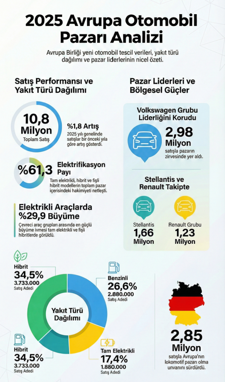 Avrupa Birliği pazarında yeni otomobil satış rakamları, geçen yıl bir önceki seneye göre yüzde 1,8 oranında bir artış kaydederek 10 milyon 822 bin 831 adet seviyesine kadar çıktı. Avrupa Otomobil Üreticileri Birliği tarafından paylaşılan 2025 yılına ait yeni otomobil tescil verileri, sektördeki hareketliliği gözler önüne serdi. Paylaşılan verilere bakıldığında, Avrupa Birliği ülkelerindeki yeni otomobil satışlarının 2025 senesinin aralık döneminde, 2024 yılının aynı dönemine oranla yüzde 5,8'lik bir yükselişle 963 bin 319 adede ulaştığı görülüyor. Geçen yılın bütününe bakıldığında ise toplam satış rakamlarının bir önceki yıl ile kıyaslandığında yüzde 1,8 oranında bir artış sergilediği ve toplamda 10 milyon 822 bin 831 adet olarak kayıtlara geçtiği izleniyor. Motor türlerine göre pazar payı ve satış adetleri Birlik bünyesindeki ülkelerde 2025 senesi boyunca satışı gerçekleştirilen yeni araçların yakıt türlerine göre dağılımı da netleşti. Bu dönemde satılan araçların yüzde 34,5'lik kısmını hibrit modeller oluştururken, benzinli araçların payı yüzde 26,6, tam elektrikli araçların payı yüzde 17,4, fişli hibrit araçların payı yüzde 9,4, dizel araçların payı yüzde 8,9 ve diğer yakıt türlerini kullanan araçların payı ise yüzde 3,3 olarak kayıtlara geçti. Bu tabloya göre geçen sene Avrupa Birliği genelinde tam elektrikli, hibrit ve fişli hibrit modellerin toplam pazar içerisindeki payı yüzde 61,3 seviyesinde gerçekleşti. Sayısal bazda incelendiğinde ise satılan otomobillerin 3 milyon 733 bini hibrit, 2 milyon 880 bini benzinli, 1 milyon 880 bini elektrikli, 1 milyon 16 bini fişli hibrit, 960 bini dizel ve 353 bini farklı yakıtlı modellerden oluştu. Elektrikli araçlarda güçlü büyüme ivmesi Geçen yılın satış verileri bir önceki yılla karşılaştırıldığında, özellikle çevreci araç gruplarındaki büyüme hızı dikkat çekiyor. Elektrikli otomobil satışlarında yüzde 29,9 oranında bir artış yaşanırken, fişli hibrit modellerin satışları yüzde 33,4 ve standart hibrit araçların satışları yüzde 13,7 oranında yükseliş gösterdi. Ülke bazındaki verilere odaklanıldığında ise Avrupa'nın lokomotif pazarlarından Almanya'da 2 milyon 857 bin adet araç satılırken, bu rakam Fransa'da 1 milyon 632 bin, İtalya'da 1 milyon 525 bin ve İspanya'da 1 milyon 149 bin seviyesinde seyretti. Üretici gruplarının pazar performansı ve sıralama Otomobil üreticileri özelinde yapılan değerlendirmede, 2025 yılında Avrupa Birliği sınırları içerisinde en yüksek satış rakamına ulaşan isim 2 milyon 988 bin 870 adet araçla Volkswagen Grubu oldu. Sektörün devlerinden olan bu grubu, bünyesinde Peugeot, Fiat, Citroen ve Opel gibi köklü markaları barındıran Stellantis Grubu takip etti. Stellantis, yıl boyunca toplam 1 milyon 660 bin 155 adet otomobil satışı gerçekleştirdi. listenin üçüncü sırasında ise 1 milyon 239 bin 693 adetlik yeni otomobil satış performansıyla Renault Grubu kendine yer buldu.