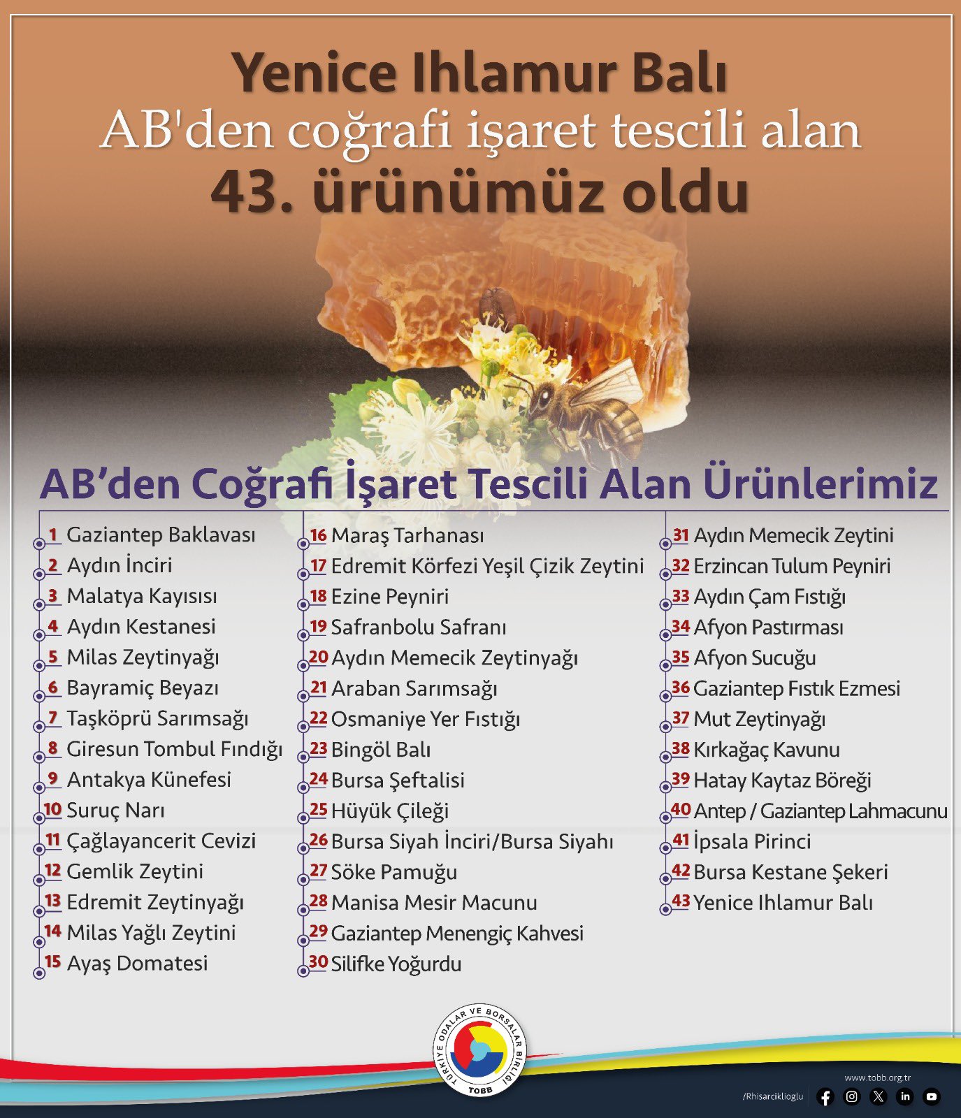 Türkiye Odalar ve Borsalar Birliği (TOBB) Başkanı Rifat Hisarcıklıoğlu, Yenice ıhlamur balının Avrupa Birliği'nden (AB) coğrafi işaret tescili alan 43'üncü ürün olduğunu bildirdi. Hisarcıklıoğlu, NSosyal hesabından konuya ilişkin paylaşımda bulundu. Yenice ıhlamur balının, AB'den coğrafi işaret tescili alan 43'üncü ürün olduğuna işaret eden Hisarcıklıoğlu, şunları kaydetti: "Karabük'e ve ülkemize hayırlı olsun. Emeği geçen herkesi kutluyorum. Dünyada çok az coğrafyaya nasip olan bir ürün çeşitliliğine sahibiz. TOBB ve oda-borsa camiası olarak yerel ve coğrafi işaretli ürünler için yoğun çaba sarf ediyoruz. AB süreci devam eden 39 coğrafi işaret ve 2 geleneksel ürün adıyla ilgili çalışmalarımız devam ediyor." Türkiye'nin AB tarafından tescillenen coğrafi işaretli ürünleri ise şöyle sıralandı: "Gaziantep baklavası, Aydın inciri, Malatya kayısısı, Aydın kestanesi, Milas zeytinyağı, Bayramiç beyazı, Taşköprü sarımsağı, Giresun tombul fındığı, Antakya künefesi, Suruç narı, Çağlayancerit cevizi, Gemlik zeytini, Edremit zeytinyağı, Milas yağlı zeytini, Ayaş domatesi, Maraş tarhanası, Edremit Körfezi yeşil çizik zeytini, Ezine peyniri, Safranbolu safranı, Aydın memecik zeytinyağı, Araban sarımsağı, Osmaniye yer fıstığı, Bingöl balı, Bursa şeftalisi, Hüyük çileği, Bursa siyah inciri, Söke pamuğu, Manisa mesir macunu, Gaziantep menengiç kahvesi, Silifke yoğurdu, Aydın memecik zeytini, Erzincan tulum peyniri, Aydın çam fıstığı, Afyon pastırması, Afyon sucuğu, Gaziantep fıstık ezmesi, Mut zeytinyağı, Kırkağaç kavunu, Hatay kaytaz böreği, Gaziantep lahmacunu, İpsala pirinci, Bursa kestane şekeri, Yenice ıhlamur balı." Kaynak: Rifat Hisarcıklıoğlu