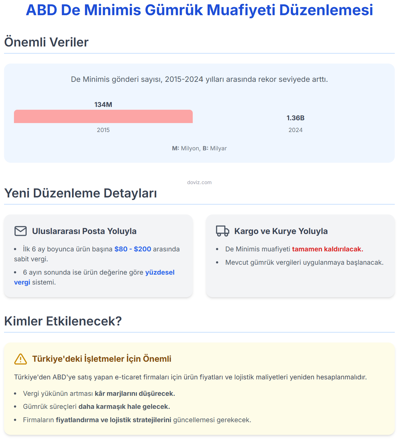 ABD Başkanı Trump tarafından imzalanan yeni kararname ile 29 Ağustos 2025 tarihi itibarıyla De Minimis gümrük muafiyeti dünya genelinde kaldırılacak. De Minimis, ABD’de 800 doların altındaki ithalatlarda gümrük vergisi uygulanmamasını sağlayan bir muafiyet sistemiydi. Bu uygulama sayesinde düşük değerli ürünler gümrüksüz şekilde ABD’ye giriş yapabiliyordu. Özellikle Çin ve diğer Asya ülkelerinden gönderilen düşük tutarlı ürünler bu kapsamda değerlendiriliyordu. Ancak zamanla bu sistem, yasa dışı ürünlerin girişi, sahtecilik vakalarının artması, güvenlik endişeleri ve vergi avantajlarının yoğun kullanımı nedeniyle tartışmalı hale geldi. ABD Gümrük ve Sınır Muhafaza Birimi verilerine göre, 2015 yılında 134 milyon adet olan De Minimis gönderi sayısı 2024 yılında 1,36 milyar adede yükseldi. Bu artış, gümrük işlemlerinin kapasitesini zorladı ve düzenleme kapsamında sağlanan vergi muafiyetinin iç pazardaki rekabet dengesi üzerindeki etkileri gündeme geldi. Bu gelişmeler sonucunda 800 dolar altı gönderiler için gümrük vergisi uygulanmasına karar verildi. Yeni düzenlemeye göre uluslararası posta yoluyla gelen ürünlerde ilk altı ay boyunca ürün başına ülkeye göre değişmek üzere 80 ile 200 dolar arasında sabit vergi uygulanacak. Altı aylık sürecin ardından ise ürün değerine göre yüzdesel vergi sistemi devreye girecek. Kargo, kurye gibi diğer lojistik yöntemleriyle yapılan gönderilerde ise De Minimis muafiyeti tamamen kaldırılarak mevcut gümrük vergileri uygulanacak. ABD’li yolcuların 200 dolara kadar kişisel eşyaları ile 100 doların altındaki bireysel hediyeler bu uygulamanın dışında tutulmaya devam edilecek. Türkiye’den ABD’ye satış yapan işletmeler açısından bu değişiklik, ürün fiyatlarının ve lojistik maliyetlerinin yeniden hesaplanmasını gerektirecek. Vergi yükünün artması kâr marjlarını düşürmesinin yanında gümrük süreçlerinin de daha karmaşık hale gelmesine yol açacak. Bu nedenle e-ihracat yapan firmaların fiyatlama, lojistik planlama ve gümrük uyum stratejilerini yeni koşullara göre güncellemeleri gerekecek. ABD'de 800 dolar altındaki siparişlerde gümrük vergisini ortadan kaldıran “de minimis muafiyeti” son olarak Çin'den gelen ürünler için kaldırılmıştı. 29 Ağustos tarihinden itibaren ise tüm dünyadan gelen ürünler için geçerli olacak. [news_id:770707]