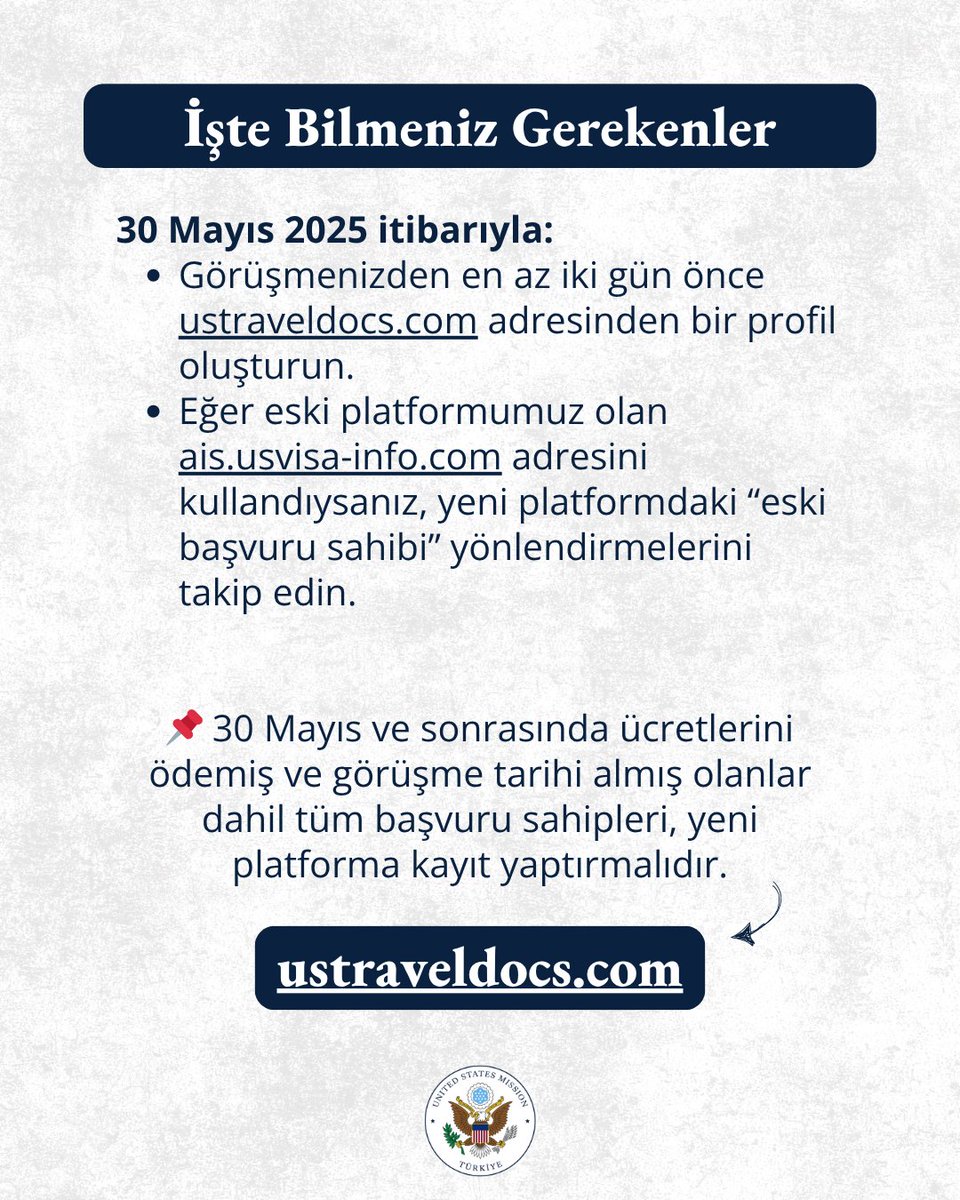 ABD Büyükelçiliği, bugünden itibaren vize başvurularının yeni bir dijital platform üzerinden gerçekleştirileceğini açıkladı. ABD Büyükelçiliği'nin sosyal medya platformu X üzerinden yaptığı paylaşıma göre, ABD vize başvuru sürecinde teknik altyapı değişikliğine gidildi. Buna göre, 30 Mayıs itibarıyla tüm başvurular "ustraveldocs" adresinden yapılacak. Mevcut randevusu bulunan başvuru sahiplerinin de randevu tarihinden en az iki gün önce yeni platform üzerinden tekrar kayıt oluşturmaları gerekecek. Kurumun konuya ilişkin açıklaması şöyle: "Türkiye'deki Vize Başvuru Sahipleri için Önemli Bilgi ABD'nin Türkiye Büyükelçiliği, 30 Mayıs 2025'ten itibaren yeni bir vize randevusu oluşturma platformuna geçecektir: ustraveldocs Başvuru ücretini ödemiş ve randevusunu almış olanlar da dahil olmak üzere tüm başvuru sahipleri vize mülakatlarından en az 2 gün önce yeni platformda kayıt oluşturmalıdır." Kaynak: U.S. Embassy Türkiye