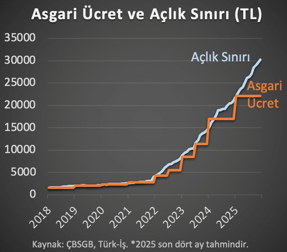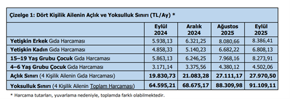 TÜRK-İŞ’in araştırmasına göre eylül ayında açlık sınırı 28 bin liraya ulaşırken, yoksulluk sınırı 91 bin liranın üzerine çıktı. TÜRK-İŞ, açlık ve yoksulluk sınırı araştırmasının eylül ayı sonuçlarını açıkladı. İlgili sonuçlara göre Ankara’da yaşayan dört kişilik bir ailenin sağlıklı, dengeli ve yeterli beslenebilmesi için yapması gereken aylık gıda harcaması tutarı (açlık sınırı) 27.970 TL’ye yükseldi. Gıda harcaması ile giyim, konut (kira, elektrik, su, yakıt), ulaşım, eğitim, sağlık ve benzeri ihtiyaçlar için yapılması zorunlu diğer aylık harcamalarının toplam tutarı ise (yoksulluk sınırı) 91.109 TL’ye çıktı. Bekâr bir çalışanın yaşama maliyeti de aylık 36.305 TL’ye ulaştı. Kaynak: Türk-İş Kara: Yıl sonunda makas yüzde 36’ya çıkabilir Merkez Bankası eski Başekonomisti Hakan Kara ise sosyal medya hesabından yaptığı paylaşımda, yıl sonunda asgari ücretin açlık sınırının yüzde 36 altına düşeceğini hesapladığını aktardı. Kara'nın hesaplamasına göre yıl sonunda açlık sınırı 30 bin liranın üzerine ulaşacak. Kaynak: Hakan Kara [news_id:786410]