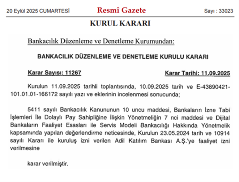 Bankacılık Düzenleme ve Denetleme Kurulu (BDDK), Adil Katılım Bankası AŞ'ye faaliyet izni verdi. BDDK'nın konu ile ilgili kararı Resmi Gazete'de yayımlandı. 5411 sayılı Bankacılık Kanununun 10 uncu maddesi, Bankaların izne Tabi İşlemleri İle Dolaylı Pay Sahipliğine İlişkin Yönetmeliğin 7 nci maddesi ve Dijital Bankaların Faaliyet Esasları ile Servis Modeli Bankacılığı Hakkında Yönetmelik kapsamında yapılan değerlendirme neticesinde, Kurulun 23.05.2024 tarih ve 10914 sayılı Kararı ile kuruluş izni verilen Adil Katılım Bankası AŞ’ye faaliyet izni verilmesine karar verildi. Kaynak: Resmi Gazete
