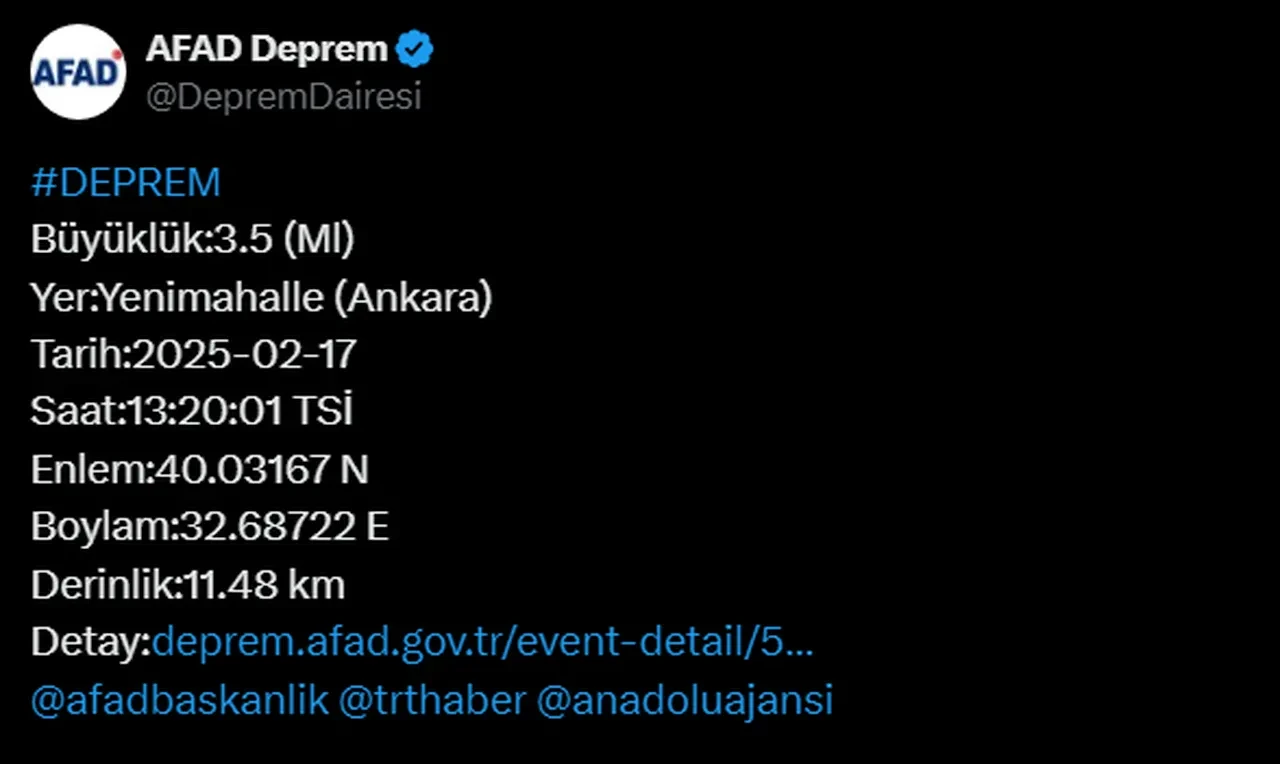 Ankara ve çevre illerde hissedilen bir deprem oldu. AFAD depremin merkez üssünü Yenimahalle, büyüklüğünü ise 3,5 olarak açıkladı. Afet ve Acil Durum Yönetimi Başkanlığının (AFAD) internet sitesinde yer alan bilgiye göre saat 13.20'de Ankara'da deprem meydana geldi. Yerin 11,48 km altında gerçekleşen depremin büyüklüğü 3,5 olarak açıklandı. Depremin merkez üssünün ise Yenimahalle olduğu bildirildi. Depremin Ankara ve çevresinde hissedildiğine ilişkin sosyal medyada da paylaşımlar yapıldı. Kaynak: AFAD - X Ankara'da yıkıcı bir deprem olur mu? Söz konusu deprem sonrası sosyal medya hesabından konuya ilişkin paylaşımda bulunan Prof. Dr. Övgün Ahmet Ercan ise şunları aktardı: "Ankara deprem bakımından çok güvenlidir. Orası Atatürk’ün başkentidir. Küçük depremler ürpertebilir, ancak yıkıcılık konusunda sakıncalı bir durum yoktur." [news_id:749397]