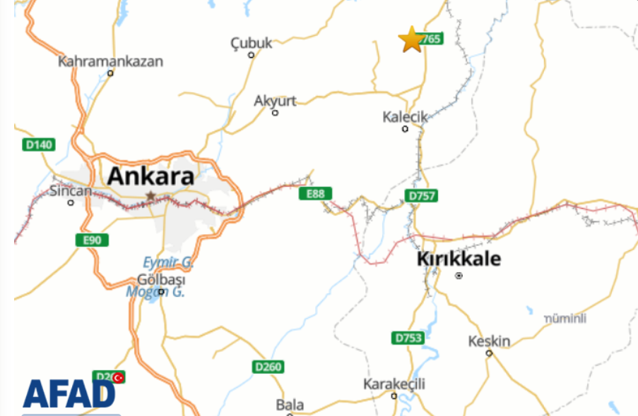 Ankara ve çevre illerde hissedilen bir deprem oldu. AFAD depremin merkez üssünü Kalecik, büyüklüğünü ise 4,1 olarak açıkladı. Afet ve Acil Durum Yönetimi Başkanlığının (AFAD) internet sitesinde yer alan bilgiye göre saat 08.24'te Ankara'da deprem meydana geldi. Yerin 11,08 km altında gerçekleşen depremin büyüklüğü 4,1 olarak açıklandı. Depremin merkez üssünün ise Kalecik olduğu bildirildi. Depremin Ankara ve çevresinde hissedildiğine ilişkin sosyal medyada da paylaşımlar yapıldı. Kaynak: AFAD