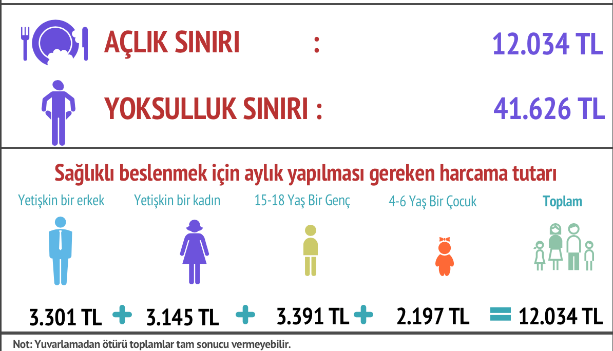 BİSAM'ın ağustos ayı Açlık ve Yoksulluk Sınırı hesaplamasına göre Türkiye'de dört kişilik bir aile için açlık sınırı 12 bin 34 TL, yoksulluk sınırı ise 41 bin 626 TL oldu. DİSK Birleşik Metal-İş Sınıf Araştırmaları Merkezi (BİSAM) Ağustos 2023 dönemi Açlık ve Yoksulluk Sınırı raporunu açıkladı. BİSAM’ın yaptığı hesaplamaya göre dört kişilik bir ailenin sağlıklı ve dengeli beslenmesi için aylık yapması gereken harcama tutarı (açlık sınırı) Ağustos 2023 için 12 bin 34 TL oldu. Açlık sınırı üzerinden hanehalkı tüketim harcamaları esas alınarak yapılan hesaplama sonuçlarına göre yoksulluk sınırı ise 41 bin 626 TL oldu. Yetişkin bir erkeğin sağlıklı ve dengeli beslenmesi için tüketmesi gereken gıdaların aylık karşılığı 3 bin 301 TL oldu. Bu değer yetişkin bir kadın için 3 bin 145 TL, 15-18 yaş bir genç için 3 bin 391 TL, 4-6 yaş arası bir çocuk için ise 2 bin 197 TL oldu. Kaynak: BİSAM Süt ve süt ürünleri grubu ilk sırada Günlük harcamalarda Ağustos 2023’de en yüksek maliyet grubunu süt ve süt ürünleri grubu 130,25 liralık harcama gereksinimi ile oluşturmaktadır. Et, tavuk ve balık grubu için yapılması gereken minimum harcama tutarı 79,28, sebze ve meyve için yapılması gereken günlük harcama tutarı 84,33 lira, ekmek için yapılması gereken harcama tutarı ise günlük 33,38 lira olmuştur. Katı yağ ve sıvı yağ ise 23,42 liralık masraf yapılması gereken ürün grubu olarak dikkat çekmektedir. Öte yandan yumurta için 8,13 lira; şeker, bal, reçel ve pekmez için ise günlük 10,59 lira harcama yapılması gerekmektedir. [news_id:702440]