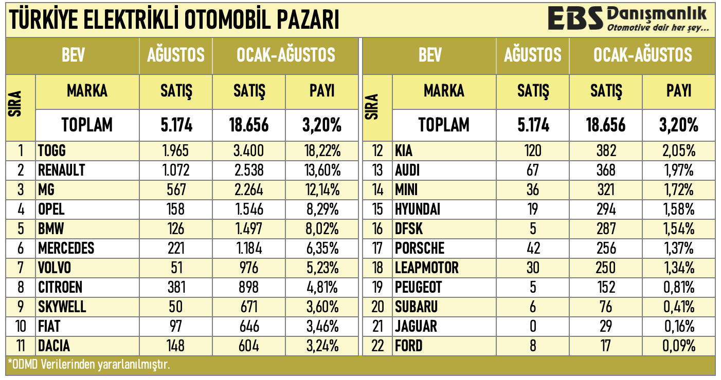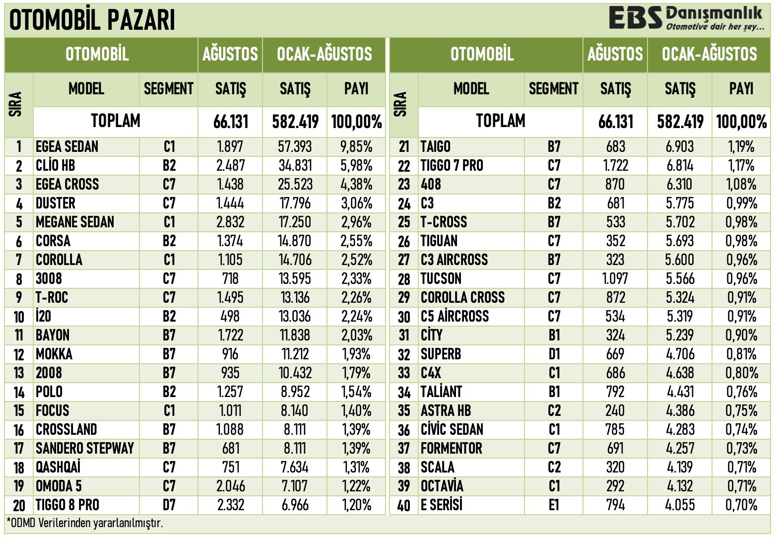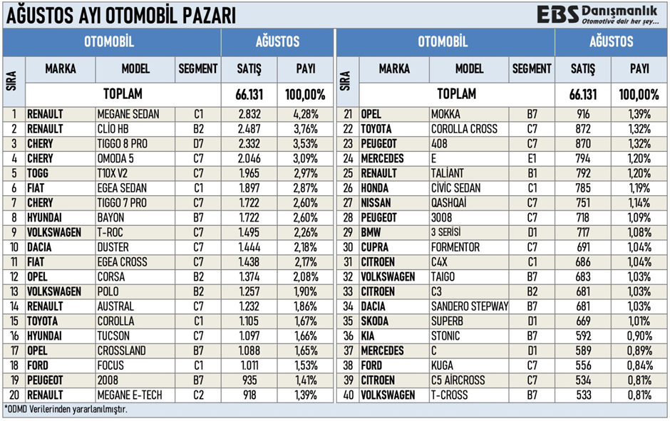 ODMD verilerine göre ağustos ayında otomotiv pazarının lideri, Fiat'ı tahtından indiren Renault Megane oldu. Peki ağustos ayında en çok satılan diğer otomotiv modelleri neler oldu? İşte detaylar.. Otomotiv Distribütörleri ve Mobilite Derneği, Türkiye otomobil ve hafif ticari araç pazarına ilişkin güncel verilerini paylaştı. Buna göre, Türkiye otomobil ve hafif ticari araç toplam pazarındaki satışlar, 2023 yılı Ocak-Ağustos döneminde bir önceki yılın aynı dönemine göre yüzde 64,7 oranında artarak 755.282 adet olarak gerçekleşti. 2023 yılı Ağustos ayı otomobil ve hafif ticari araç pazarındaki satışlar ise bir önceki yılın aynı ayına göre yüzde 78,9 artarak 86.454 adet oldu. [news_id:706189] Ağustos ayında en çok satan modeller EBD Danışmanlık tarafından ODMD verilerinden derlenen bilgiye göre ise Renault Megane modeli ağustosta en çok satan model olurken, Clio modeli ikinci sırada yer aldı. Bu araçların satış adeti sırasıyla 2.832 ve 2.487 olarak kaydedildi. Öte yandan, Chery Tiggo 8 üçüncü ve Omoda 5 dördüncü sıra yer aldı. Tiggo 8 Pro 2.332 adet satarken, Omoda 5 1.965 adet sattı. Yerli araç TOGG T10X ise 1.965 satış adedi ile beşinci sıraya yerleşti. Son 8 ayında satışta lider isim Fiat Egea ise bu ağustosta altıncı sırada yer aldı. Buna göre Egea ağustosta 1.897 adet sattı. Kaynak: Erol Şahin - X Ocak-ağustos ayları arasında en çok satılan modeller: 8 ay sonunda en çok satılan modellere baktığımızda ise Egea'nın sektörde üstünlüğünü koruduğunu gördük. Buna göre, Clio listede ikinci, Egea Cross ise üçüncü sırada kendine yer buldu. Kaynak: Erol Şahin - X Ağustos ayında elektirikli araç piyasasının liderleri: Otomotiv gazetecisi Emre Özpeynirci'nin sosyal medya hesabından yaptığı paylaşıma göre, elektrikli araçlar arasında Togg zirveye çıkarken; Tesla ise ODMD’ye kayıtlı olmadığı için listede yer almadı. Buna göre elektrikli araç pazarındaki satışlar ise şöyle oluştu: Kaynak: Erol Şahin – X