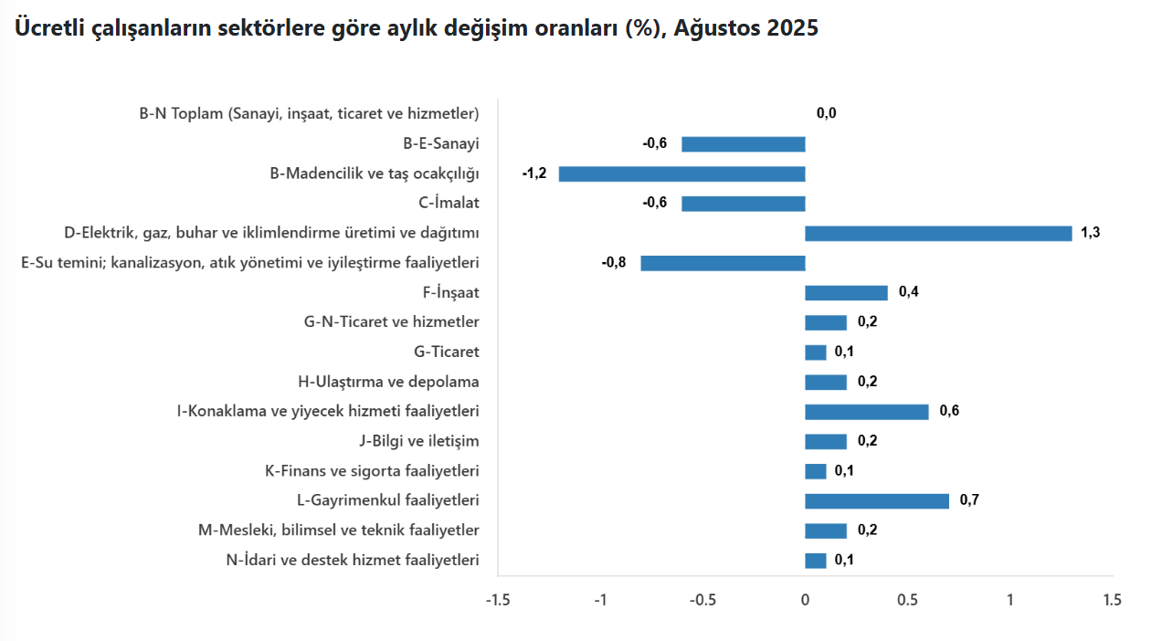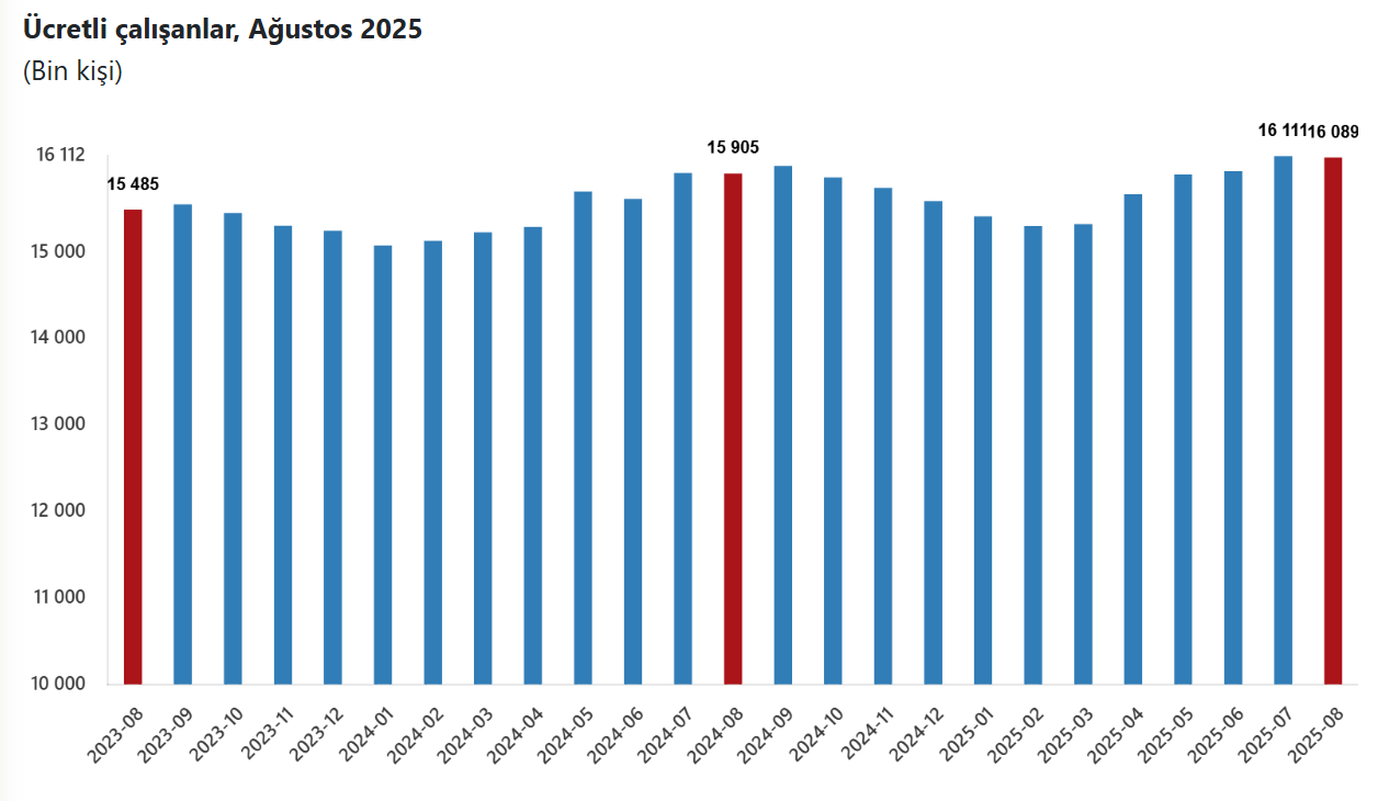 Sanayi, inşaat ve ticaret-hizmet sektörlerinde ücretli çalışan sayısı, ağustosta geçen yılın aynı ayına göre yüzde 1,2 artarak 16 milyon 89 bin 450 kişiye çıktı. Türkiye İstatistik Kurumu (TÜİK), ağustos dönemine ilişkin ücretli çalışan istatistiklerini yayımladı. Buna göre, Ağustos 2024'te 15 milyon 904 bin 602 kişi olan sanayi, inşaat ve ticaret-hizmet sektörlerinde ücretli çalışan sayısı, bu yılın aynı döneminde yüzde 1,2 artışla 16 milyon 89 bin 450 kişiye yükseldi. Söz konusu ayda ücretli çalışan sayısı, sanayi sektöründe yıllık bazda yüzde 3,6 azalırken inşaatta yüzde 7,2, ticaret-hizmetlerde yüzde 2,6 arttı. Kaynak: TÜİK Aylık değişim Sanayi, inşaat ve ticaret-hizmet sektörleri toplamında ücretli çalışan sayısı, ağustosta bir önceki aya göre yüzdesel değişim göstermedi. Bu dönemde ücretli çalışan sayısı, sanayi sektöründe yüzde 0,6 azaldı, inşaatta yüzde 0,4 ve ticaret-hizmetlerde yüzde 0,2 artış gösterdi. Kaynak: TÜİK