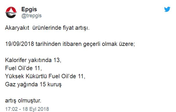 Enerji Petrol Gaz İkmal İstasyonları İşveren Sendikası (EPGİS)'nin Twitter üzerinden yaptığı açıklamaya göre; fuel oil, gaz yağı, kalorifer yakıtı ve yüksek kükürtlü fuel oile bu gece yarısından itibaren geçerli olmak üzere zam geleceği duyuruldu. EPGİS’in resmi Twitter hesabından yapılan açıklamaya göre fuel oil ve yüksek kükürtlü fuel oile 11, gaz yağına 15, kalorifer yakıtına 13 kuruş zam geldi.