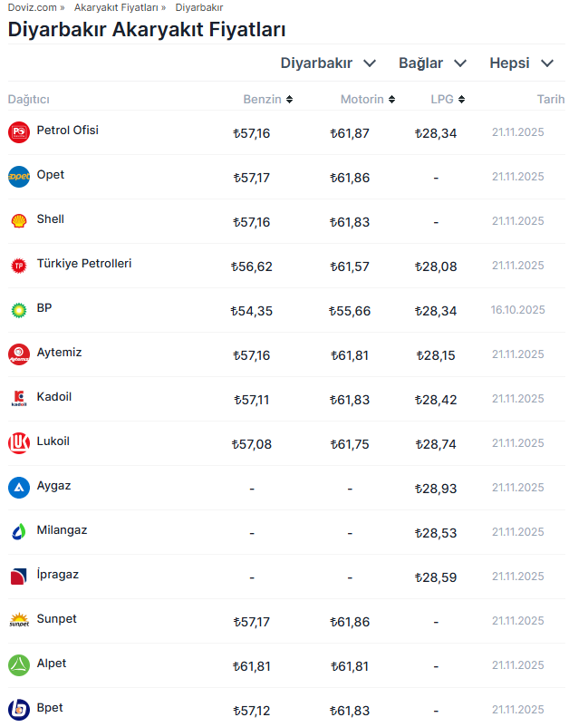 Kasım ayının başında zamlanan motorin fiyatlarında gece saatleri itibarıyla yeni bir artış daha gerçekleşti. Gelen son zammın ardından birçok ilde tabela 62 lira sınırına yaklaştı. Kasım ayının başında fiyat artışı gerçekleşen motorin fiyatlarına gece saatlerinden itibaren geçerli olmak üzere yeni bir zam daha yapıldı. Buna göre motorinin litresinde ortalama 1,80 TL fiyat artışı gerçekleşti. Benzin ve LPG fiyatlarında ise herhangi bir değişiklik uygulanmadı. Güncel akaryakıt fiyatları (21 Kasım 2025) Gelen zam sonrası motorinin litresi İstanbul Avrupa Yakası'nda ortalama 59,47 TL, Bursa’da 60,45 TL, Ankara'da 60,50 TL, İzmir'de 60,84 TL, Adana'da 61,40 TL, Antalya'da 61,86 TL ve Diyarbakır'da 61,87 TL olarak belirlendi. Dağıtım şirketi bazlı akaryakıt fiyatları ise şöyle listelendi: Akaryakıt fiyatları nasıl hesaplanıyor? Türkiye'de benzin ve motorin fiyatları hesaplanırken; Gümrüksüz rafineri fiyatına ÖTV ve EPDK payının eklenmesiyle KDV hariç Rafineri satış fiyatı bulunuyor. Gümrüksüz Rafineri Fiyatı hesaplanırken ise Akdeniz-İtalyan piyasasında yayınlanan günlük CIF Akdeniz ürün fiyatları ve günlük dolar kuru takip edilerek, belli bir fiyat değişim farkında gümrüksüz rafineri tavan satış fiyatı elde ediliyor. [news_id:791744]
