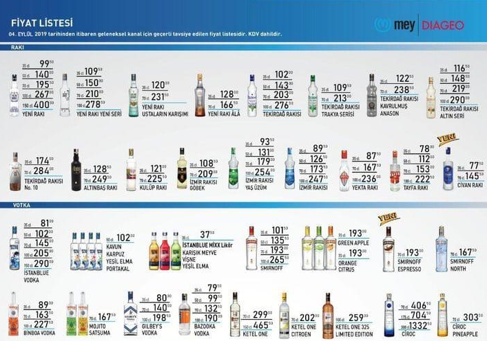 Mey Grup İstanbul Anadolu Yakası Distibütörlüğü'ne dayandırılan fiyat listesiyle alkole yüzde 30 oranında zam yapılacağı iddia edildi. Söz konusu iddiaya göre 70'lik Yeni Rakı fiyatı 195 TL olacak. Sosyal medyada dolaşıma sokulan ve Mey Grup İstanbul Anadolu Yakası Distibütörlüğü'ne dayandırılan fiyat listesi ile birlikte alkole yüzde 30 oranında zam geleceği iddia edildi. Söz konusu iddiaya göre şu anda 77 TL olan 35'lik Yeni Rakı'nın fiyatı 99.50 TL'ye yükselecek. 70'lik Yeni Rakı'nın fiyatı ise 152 TL'den 195 TL'ye çıkacak. Dolaşıma sokulan fiyat listesiyle ilgili olarak Mey Grup'tan henüz bir açıklama yapılmadı.