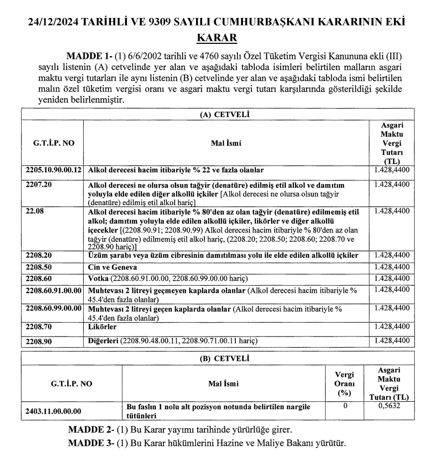 Cumhurbaşkanı Erdoğan'ın imzasıyla Resmi Gazete'de yayımlananan karara göre bazı alkollü içeceklerden alınan maktu ÖTV tutarlarına zam yapıldı. Resmi Gazete'de yayımlanan kararla alkollü içeceklerde maktu ÖTV tutarları artırıldı. Karar kapsamında alkol oranı yüzde 22 ve üzeri olan içkilerde uygulanan maktu ÖTV oranı 3 Temmuz 2024'ten bu yana geçerli olan 1.269,7257 TL seviyesinden 1.428,44 TL'ye yükseltildi. Alkol derecesi ne olursa olsun tağyir edilmiş (denatüre) etil alkol ve damıtım yoluyla elde edilen diğer alkollü içkilerde de maktu ÖTV tutarı 1.428,4400 TL olarak belirlendi. Yeni düzenlemeler, bu gece (25.12.2024 - 00:01) Resmi Gazete’de yayımlanarak yürürlüğe girdi. Kaynak: Resmi Gazete Fiyatlara nasıl yansıyacak? Ekonomistler ise %40 alkol içeren 70 cl'lik bir şişenin fiyatının: (1.428-1.269) x 0,7 x 0,4 x 1,2 KDV ≈ 54 TL artmasının beklendiğini bildirdi.