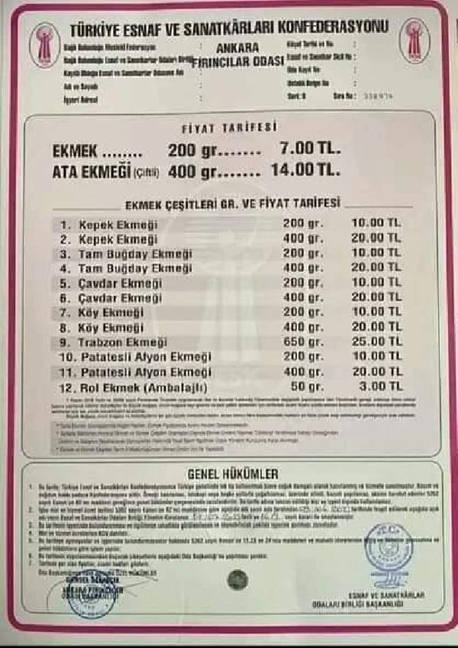 Ankara Fırıncılar Odası'nın aldığı kararla, Ankara'da 200 gram ekmeğin fiyatı yüzde 40 zamlandı. Buna göre 5 liradan satılan 200 gramlık ekmek fiyatı 7 liraya çıkarıldı. Kepek, tam buğday ve çavdar ekmeğin fiyatı ise 8 liradan 10 liraya yükseltildi. Yeni fiyatların ise 20 Temmuz'dan itibaren geçerli olacağı bildirildi. Kaynak: NTV [news_id:701246]